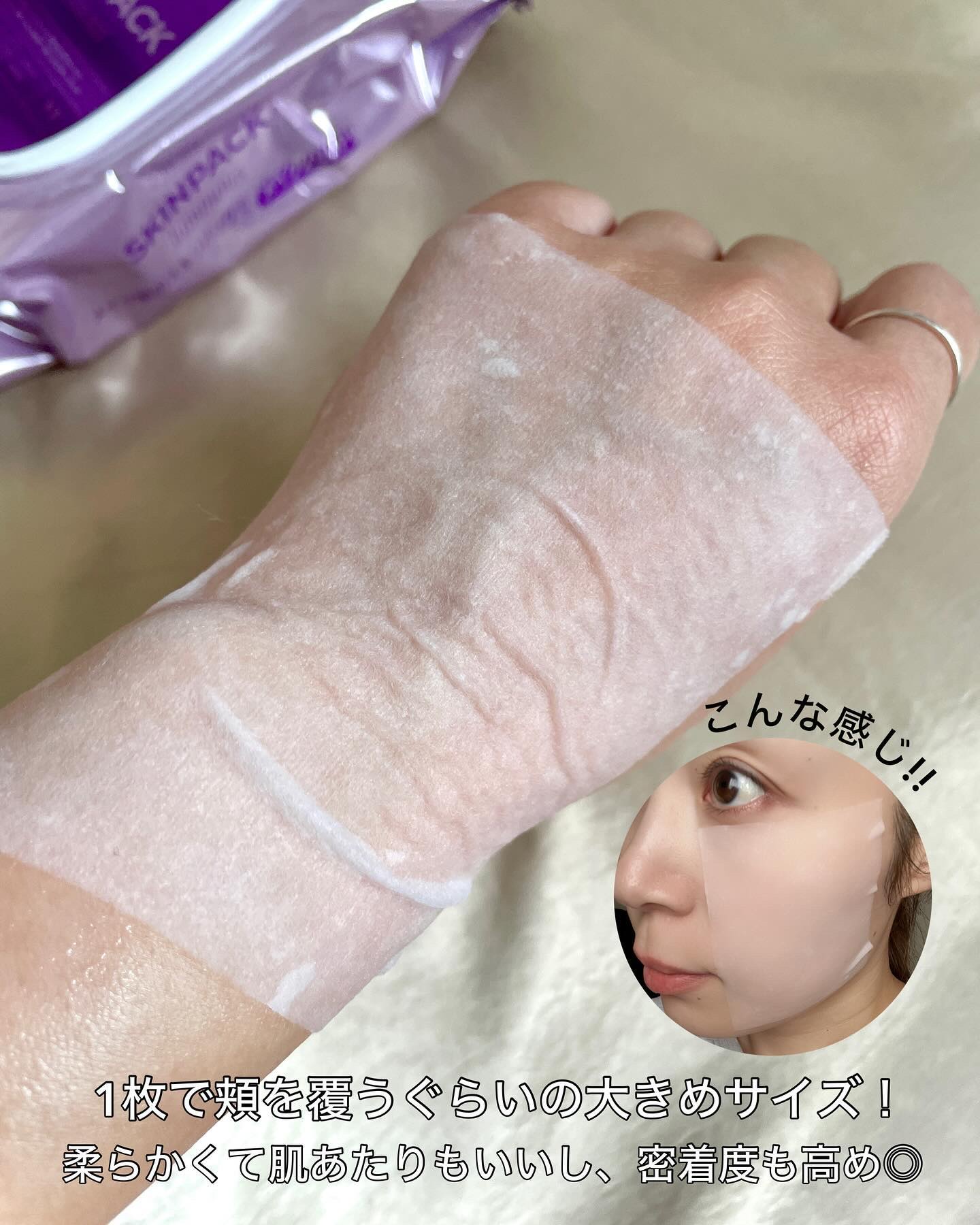 100枚1650円とコスパが良すぎて 発売当初から売り切れが続いてたアイテムです! 密着度が高いし液が垂れてこないから、マスクをしながら他の作業がしやすくて、忙しい朝にピッタリなアイテムだと思いました! 私のイチオシはマイルドスキンパック💚 普段から乾燥と赤みに悩まされてるのでこれでメイク前ケアを頑張ってみます!
