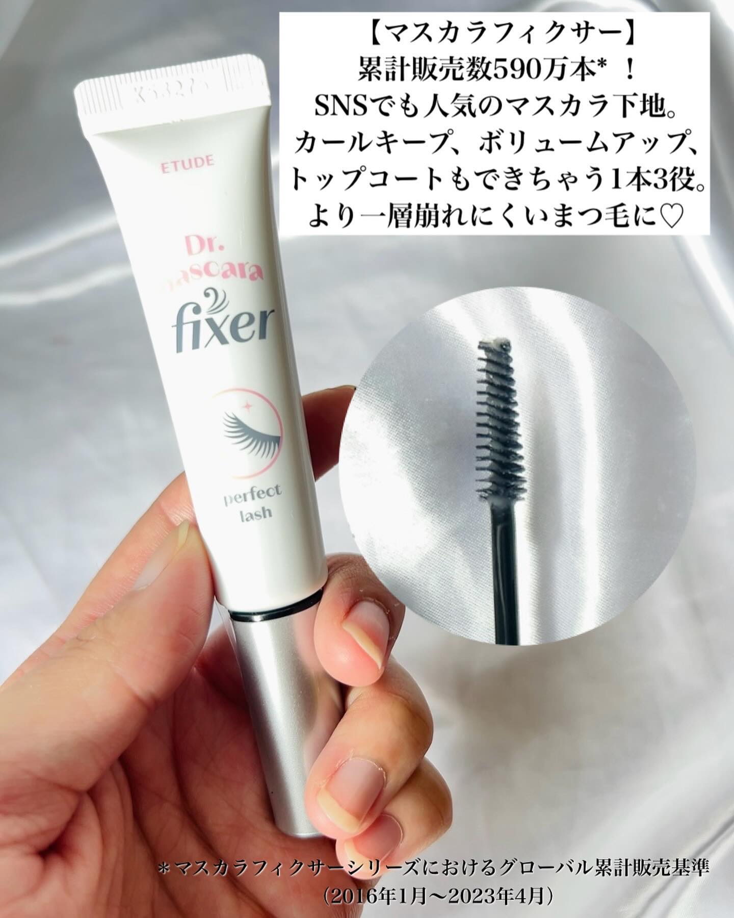 #エチュード の人気マスカラからボリュームタイプ登場🖤 既存のカールフィックスマスカラのブラシより細めで、四角にカッティングされ、目の曲線に沿ってカーブしたスクエアフィットブラシが特徴。 くっきりとしたクリアブラックで印象的なまつ毛を演出 細めのブラシなので、細かいことろにも使いやすくて、下まつ毛にも塗りやすいです。 まつ毛のカールを長時間キープしてくれる#マスカラ下地 カールキープ、ボリュームアップ、トップコートの1本3役👀