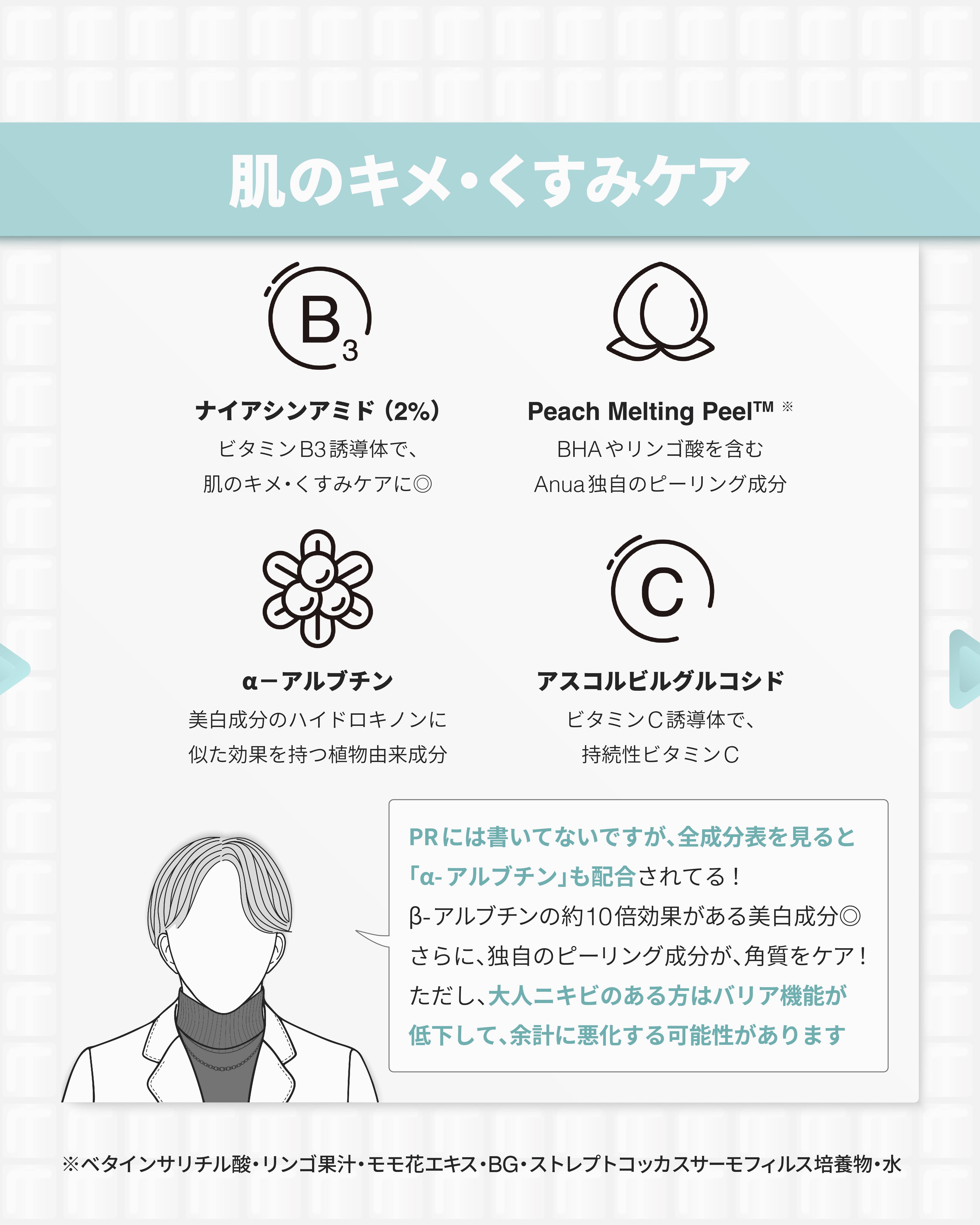 - <250ml> モモ果実エキス、2,3-ブタンジオール、水、グリセリン、DPG、ナイアシンアミド、BG、1,2-ヘキサンジオール、乳酸桿菌発酵液、メチルプロパンジオール、ストレプトコッカスサーモフィルス培養物、リンゴ果汁、ビフィズス菌培養溶解質、バチルス発酵物、メシマコブエキス、キシロース、ガラクトミセス培養液、α-アルブチン、モモ花エキス、ヒアルロン酸Na、加水分解野菜タンパク、ラウリン酸ポリグリセリル-10、プロパンジオール、スクワラン、(アクリレーツ/アクリル酸アルキル(C10-30))クロスポリマー、トリ(カプリル/カプリン酸)グリセリル、ジフェニルジメチコン、トリエチルヘキサノイン、エチルヘキシルグリセリン、イソステアリン酸ポリグリセリル-10、アデノシン、水添リゾレシチン、グリチルリチン酸2K、トロメタミン、ポリアクリル酸Na、パンテノール、ヒアルロン酸クロスポリマーNa、セラミドNP、アラントイン、シアノコバラミン、ポリグルタミン酸、ステアロイルグルタミン酸Na、トコフェロール、アスコルビルグルコシド、ベタインサリチル酸、アスコルビン酸、マルトデキストリン、グリシン、セリン、グルタミン酸、アスパラギン酸、ロイシン、アラニン、リシン、アルギニン、チロシン、フェニルアラニン、プロリン、トレオニン、バリン、イソロイシン、ヒスチジン、システイン、メチオニン、キサンタンガム、香料