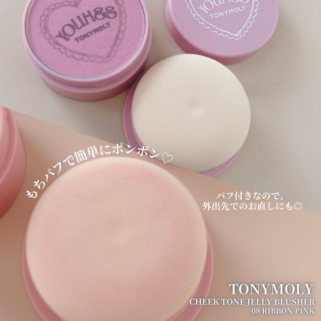 .:▪️TONYMOLY▪️CHEEKTONEJELLYBLUSHERColor:04FUZZYPEACH▫️使用感▫️外出時のお直しチークを探していたところ発見チーク本体とパフが一体化👏🏻軽量コンパクトなので持ち運びにも便利ですもっちりパフ...