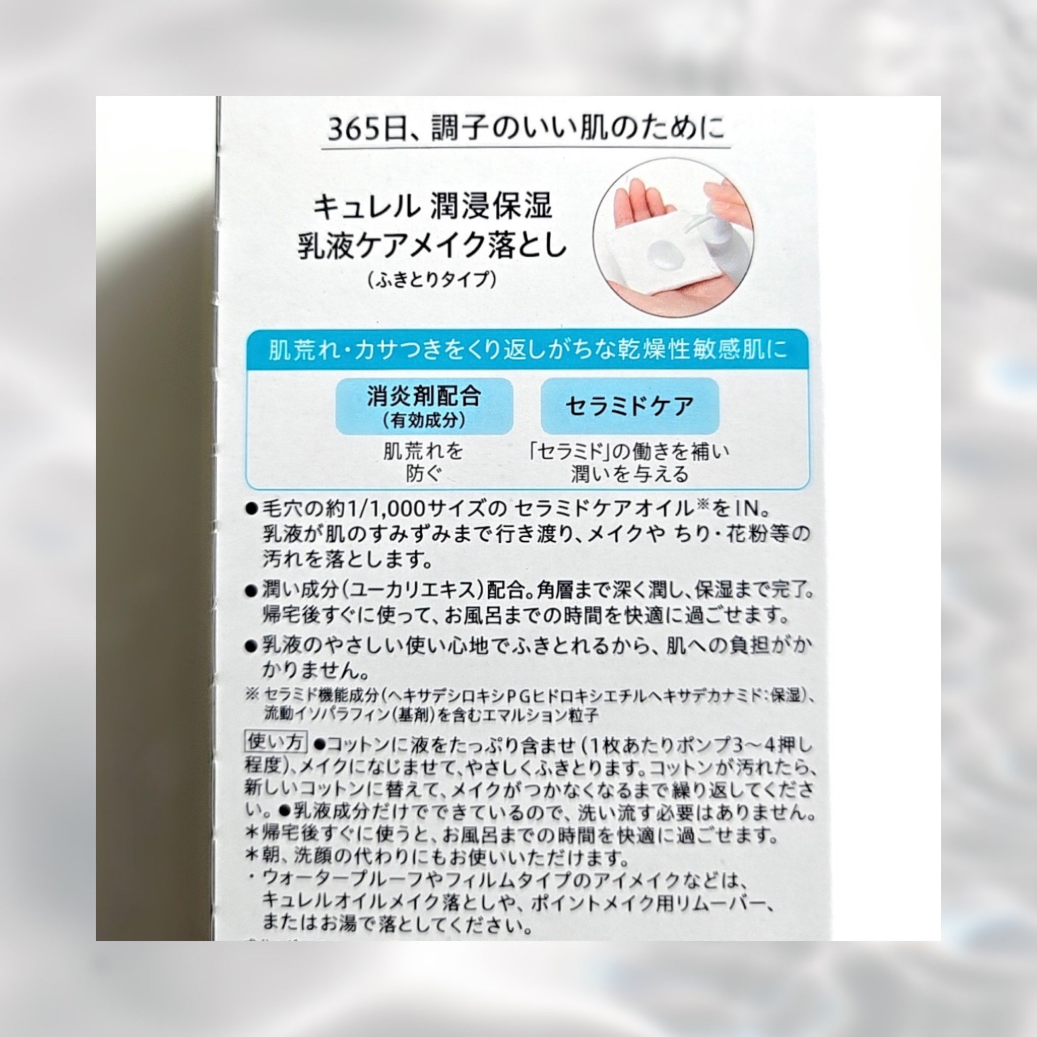 - 【敏感肌用】【医薬部外品】 乳液でメイク汚れをふきとり、同時に「セラミド」の働きを補い、潤った肌へ 乳液ケアだから洗い流しいらず、さっとふきとるだけ ●毛穴の約1/1000サイズのセラミドケア※1オイル※2をIN。乳液が肌のすみずみまで行き渡り、メイク汚れを落とす。ふきとりメイク落とし。※1「セラミド」の働きを補い、潤いを与える※2セラミド機能成分(ヘキサデシロキシPGヒドロキシエチルヘキサデカナミド)(保湿)を含む流動イソパラフィン(基剤) ●消炎剤配合。肌荒れを防ぐ ●潤い成分(ユーカリエキス)配合。角層まで深く潤し、保湿まで完了 商品に関するお問い合わせ 受付時間9:00~17:00(土曜・日曜・祝日除く) *製品の誤飲・誤食など緊急の場合は、受付時間外でもお電話ください キュレル:0120-165-698 ※1「セラミド」の働きを補い 潤いを与える ※2 セラミド機能成分(ヘキサデシロキシPGヒドロキシエチルヘキサデカナミド) (保湿)、流動イソパラフィン(基剤)を含むエマルジョン粒子