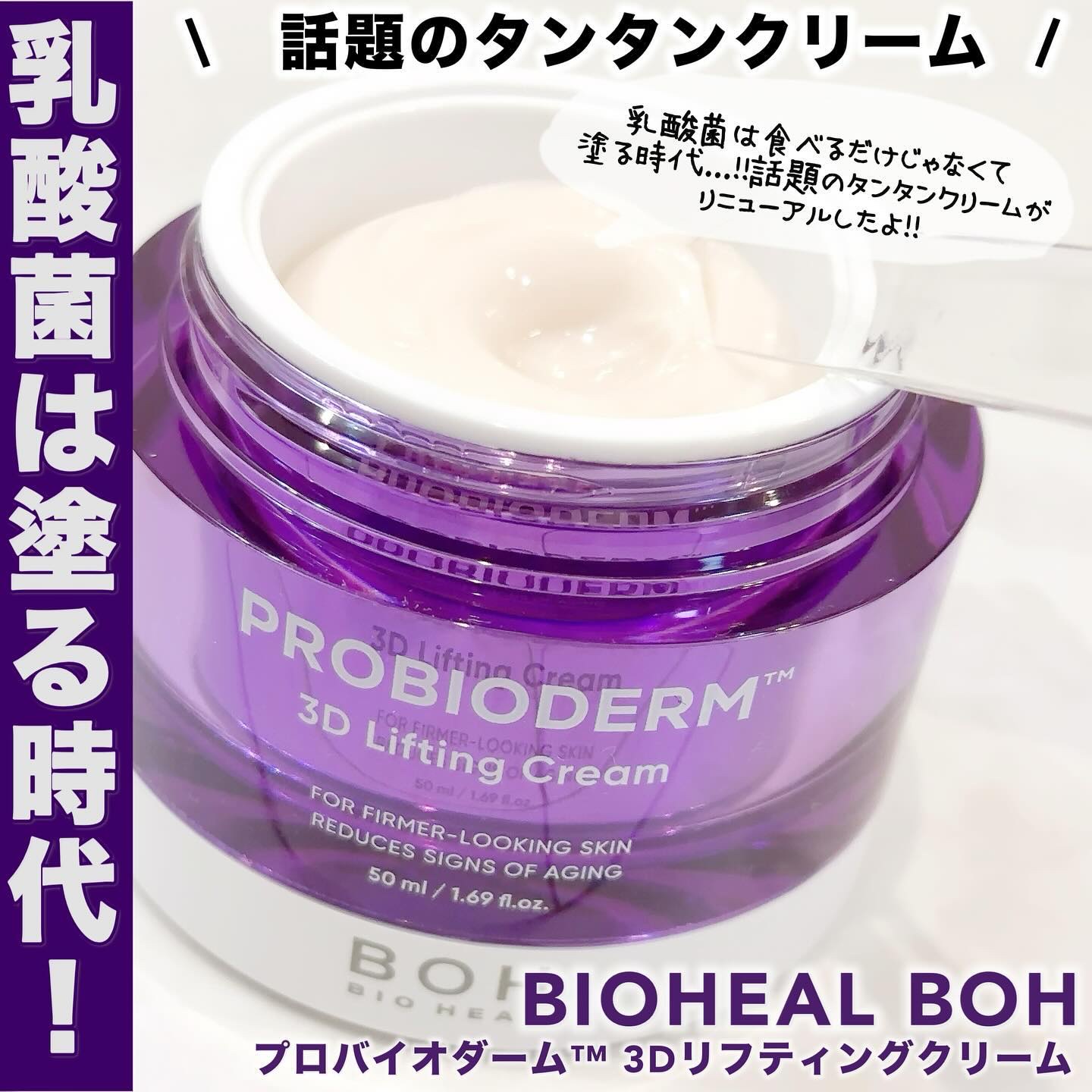 - プロバイオダーム™ 3D リフティングクリーム ・既存のタンタンクリームが、より一層のハリ弾力ケアができる商品としてパワーアップ※! ★プロバイオダーム™ 3Dリフティングクリームリニューアルポイント★ ①BIOHEAL BOHが厳選した乳酸菌*のみ配合した独自保湿成分!「プロバイオダーム™」 BIOHEAL BOHの厳しい審査のもとに選び抜かれた肌バリアをサポートする独自の乳酸菌*でハリ弾力ケアを! →キーワード #ハリ活乳酸菌 *厳選した乳酸菌:ラクトバチルスプランタラム&ラクトバチルスラムノサス&ラクトバチルスロイテリ(全て保湿) ②肌本来の弾力維持に欠かせない成分をプラス!肌が持つ成分を補うことで、ふっくらうるおった肌のハリ感をキープ ③ペプチドが12種から17種に!肌バリアを形成。素肌をすこやかに保ちます。 ・もちっと密度の高いクリームで保湿&ハリケア。 バイオヒールボ独自の技術で肌表面をピンとハリをあたえ、よりハリ感が得られるテクスチャーを実現 ・3Dと訴求しているように、ふっくらうるおい感のある多面的な弾力ケアができることから、韓国語でしっかりハリのある様子を表現するタンタン(탄탄)のワードと組み合わせて「3Dタンタンシクリーム」という愛称ができました。 ・もちっと密度の高いクリームで弾力のある素肌に導くエイジングケア※2クリーム。 ※同商品リニューアル前に比べて ※2年齢に応じたケアの事