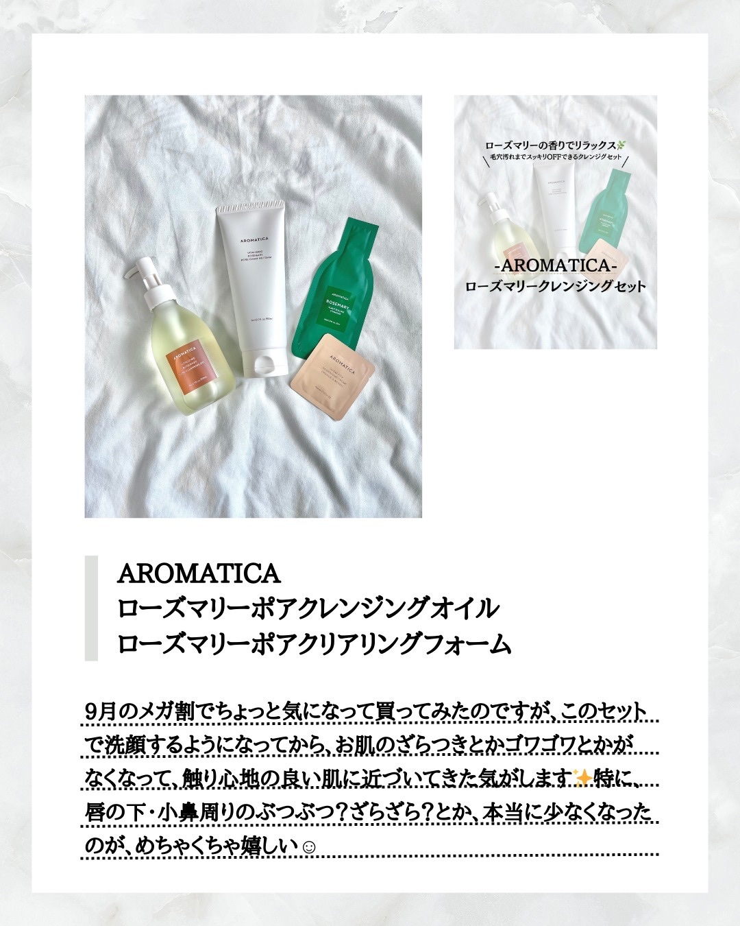 AROMATICAバイタライジング ローズマリーポアクレンジングフォーム公式より ⭐︎毛穴をキレイにする洗浄 ⭐︎洗顔によって変わる肌の調子 ⭐︎しっとり感を与え、油分は取り除く 感想 泡立ちがよくきめ細かいです! 香りが良くて癒されます。 ...