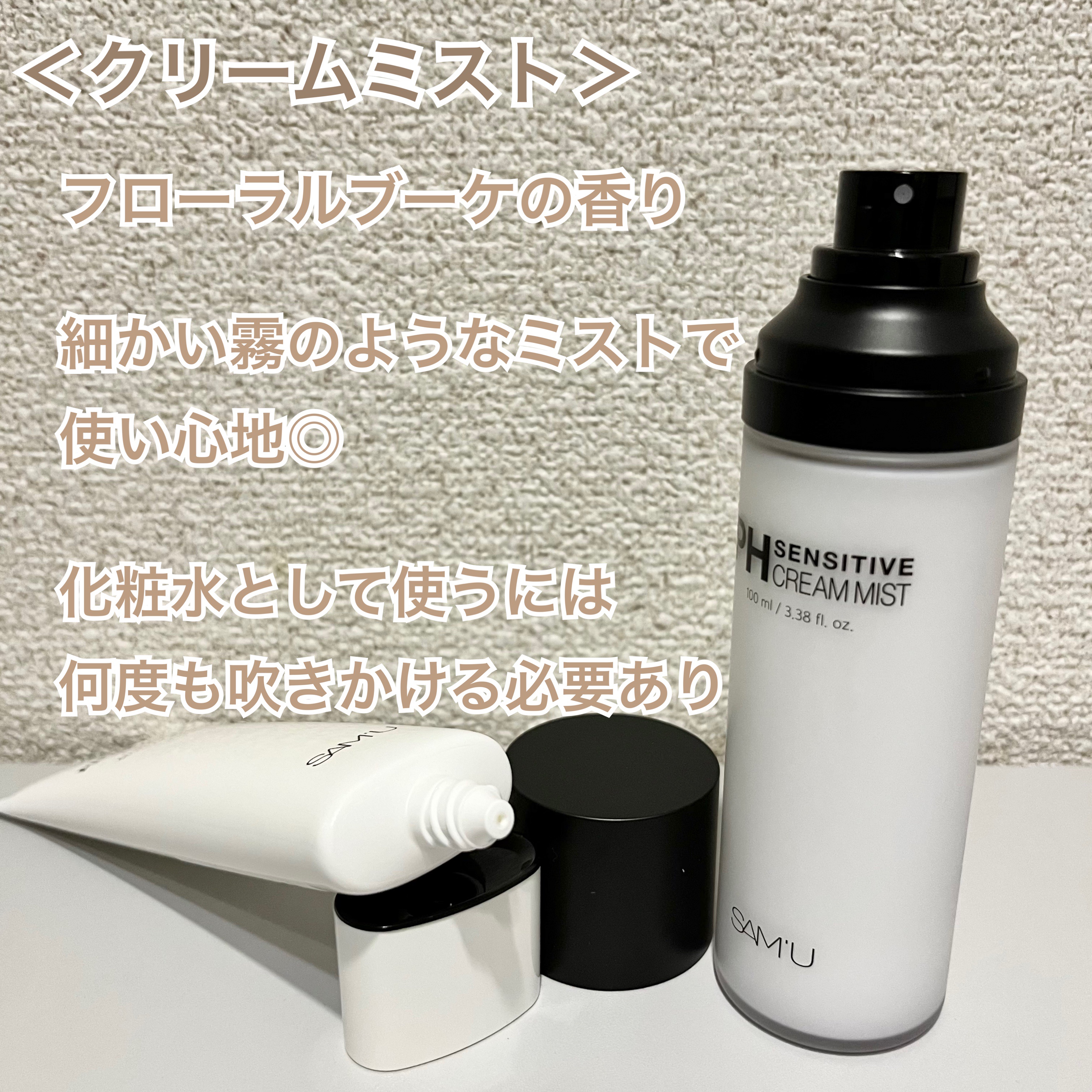 きめ細かいミストで、敏感肌の私でも、お肌への刺激が感じられませんでした! 名前の通り、クリームミストなので、高保湿だけど、ベタつかなくて、日中やメイク後にも、保湿できるのでお気に入りです! このクリームがサミュで特に人気だと思います!私もこの時期、乾燥しやすいので、愛用しています!しかもチューブタイプの方は、取り出しやすくて使いやすいのでお気に入りです! しっとり高保湿で、毎日のスキンケアはもちろん、特に乾燥している日にも使いやすいのでとっても良かったです!
