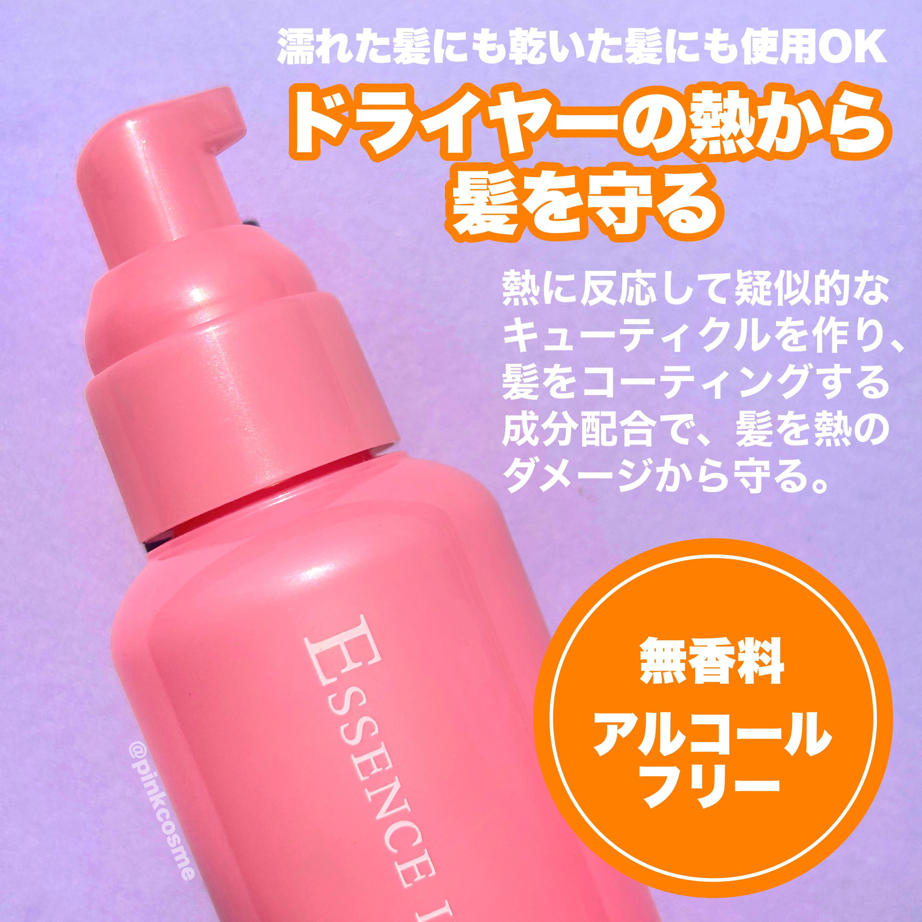 - パサつき、広がり、枝毛、ツヤ不足・・・髪のお悩みは尽きないもの。 エッセンスインヘアミルクは、そんな乾燥によるお悩みにアプローチする洗い流さないタイプのトリートメントです。 サロン業界注目の美髪成分「CMC」を配合。この「CMC」は、髪内部の成分が流れ出るのを防ぐ重要な保湿成分で、一度「CMC」を失うと自ら作り出すことはできないので、補うケアが不可欠なのです。 使用方法は簡単。適量を手にとって、タオルドライ後の髪(または乾いた髪)に、毛先を中心になじませます。 ドライヤーの熱を味方にして、サラサラつるんの指通りを実現します。 さらに高保水ミルクが、うるおいを逃がさないように髪表面をコート。内外からのしっかりケアで、うるおい艶美髪をずっとキープします。 ●無香料、無着色 ●酸化しやすい油分不使用●浸透美容液成分配合=CMC類似成分、11種のアミノ酸をブレンドした毛髪補修成分●高保水ミルク配合=保水効果の高い毛髪保護成分●ヒートプロテイン配合=毛髪保護成分●シャイニーグロス成分配合=ツヤ成分●アルコールフリー ※アレルギーテスト済=全ての方にアレルギーが起こらないということではありません。