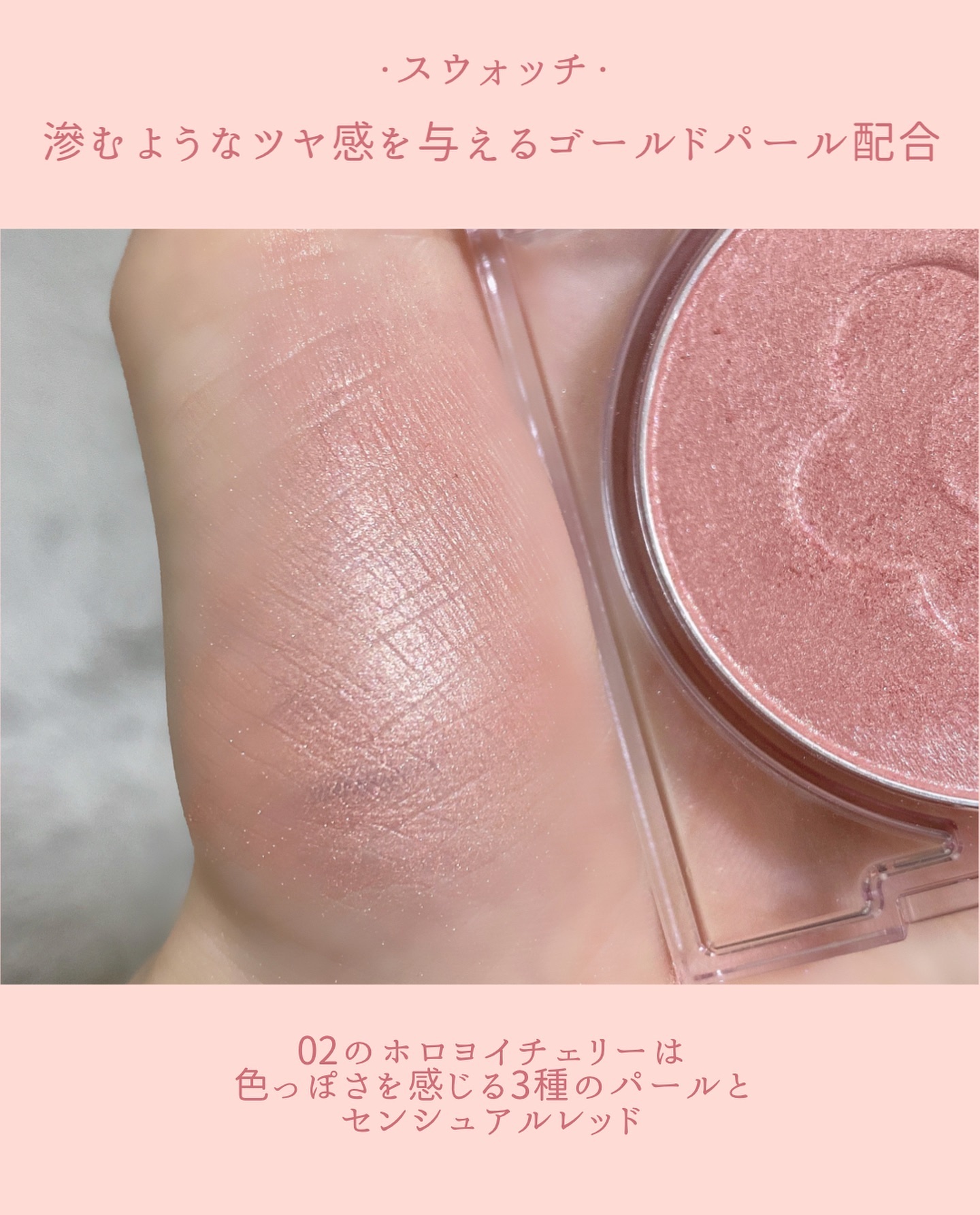 - ふんわり肌に溶け込むように馴染み、血色感を自在に操る大人気高密着チーク&ハイライトに春の新色が登場! 今回の新色は、チーク2色とハイライト1色。 春らしい透明感ときらめくツヤ肌を演出するダイヤモンドコレクションとして、2つのカラーが混ざり合うダイヤモンドカットの見た目にも美しいデザイン。 いずれのカラーもこだわりの偏光パールを配合し、肌に自然になじみながら、ツヤと華やかさを演出。 高保湿タイプのトリプル美容オイル*1とうるおい持続パウダー*2配合で、お肌にうるおいを与えます。 *1:ダマスクバラ花油、カニナバラ果実油、アルガニアスピノサ核油(全て保湿成分) *2:シリカ(粉体基剤)、ヒアルロン酸Na(保湿成分)