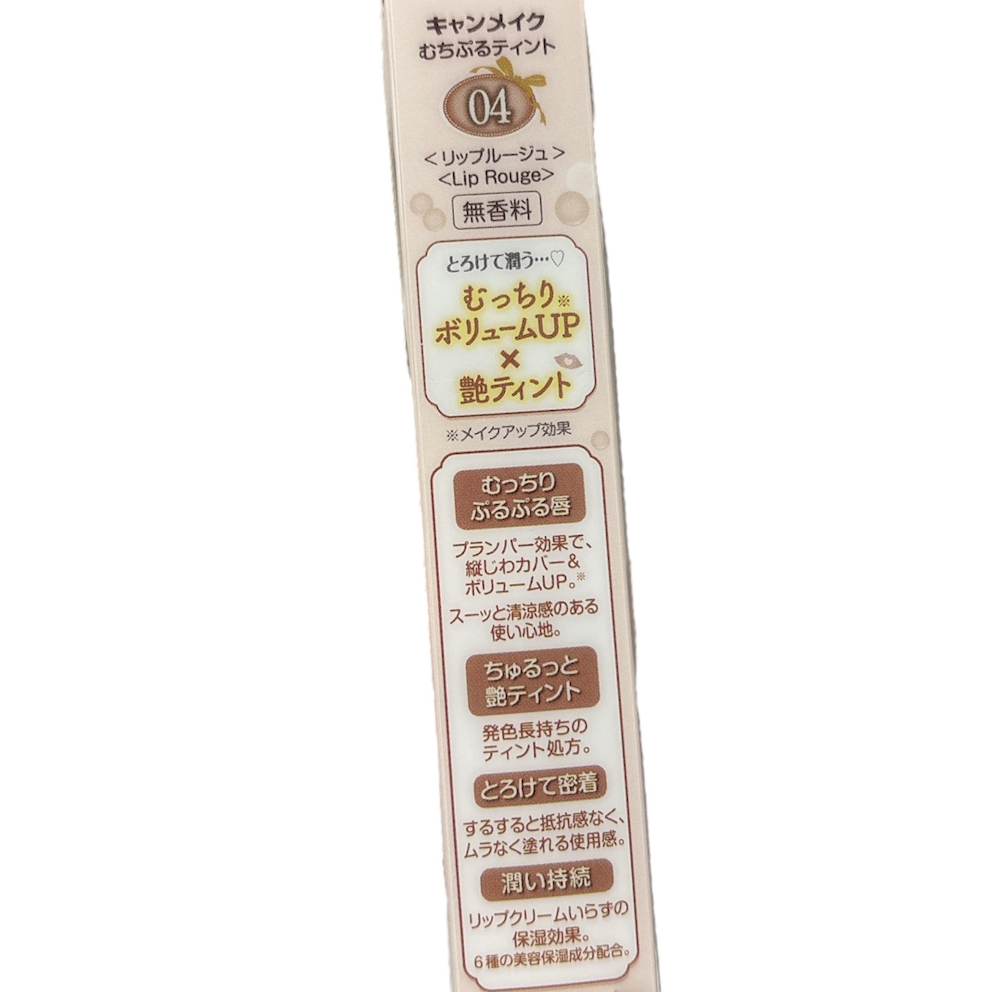- とろけて潤うむっちりぷるぷる唇に! その名の通り、むっちりとしたボリューム感とぷるぷるツヤツヤな魅力的な唇に仕上がるティントリップです。 Point1【むっちりぷるぷる唇】 ・プランパー効果で縦じわカバー&ボリューム感のあるむっちり唇に ※メイクアップ効果による ・スーッとした清涼感のある使い心地 Point2【ちゅるんとしたツヤティント】 ・シロップのようなちゅるんとしたツヤが持続 ・塗った時の色が長持ちするティント処方 唇の上でとろけるメルティングオイルを配合しています。 するすると抵抗感がなく、なめらかな塗り心地で、重ね塗りをしてもムラなくきれいに仕上がります。 6種の美容保湿成分配合。リップクリームいらずで潤いが持続します。 ≪ワセリン・ヒアルロン酸・コラーゲン・アルガンオイル・ハチミツ・シアバター≫ 無香料 ・清涼感のある使い心地です。 ・大変やわらかい中身ですので、1㎜程度くり出して、ゆっくりやさしく塗布してください。 ・一度繰り出した中身は戻りませんので、出し過ぎにご注意ください。