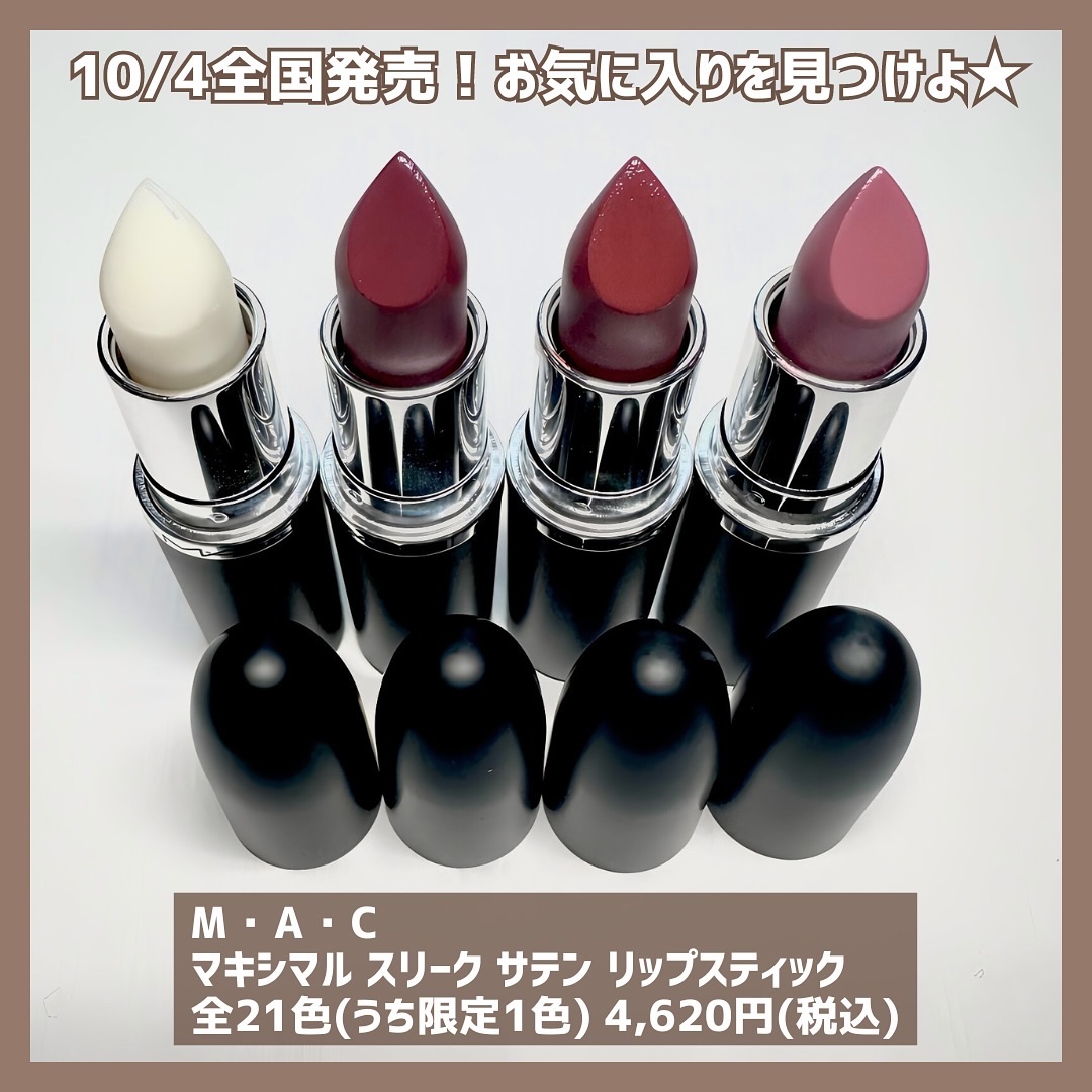 - <価格改定>2025年7月1日より¥4,620(税込)から¥4,400(税込)に改定いたします。 保湿成分をM・A・C史上最高*濃度で閉じ込め 驚きの濃密発色・贅沢なつや・うるおいで、つやオーラリップを作る #美容液サテンリップ が登場。 ①美容保湿成分をM・A・C史上最高*1濃度で配合した、#美容液サテンリップ: 新・マキシマルスリークサテンリップスティックは、高発色でありながら、乾燥レスなサテンのつやをまとわせます。 その秘密は、うるおいを作り出す厳選した天然由来の美容保湿成分をM•A•C史上最高*1濃度で配合しているから。美容の果実と言われる、ザクロから抽出されたザクロ花エキス*2をはじめ、ローズヒップオイル*2、ユチャ種子油*2を配合しています。 乾燥しがちな唇のすみずみまで濃厚な潤いを与え、みずみずしい仕上がりが続きます。 発色も欲しい、保湿も欲しい、そんな人の為の #美容液サテンリップです。 「発色は良いけど乾燥する」と思われてきたM•A•Cのリップが進化!発色と保湿を両立です。 ②リップ&チークのマルチユース: リップスティックとしてだけでなく、チークとしても使えます。 これ1本で、トレンドのワントーンメイクを簡単に表現できます。 ③毎日のどんなシーンにも使える、厳選された色展開: M•A•Cのリップは、派手な色が多くて、毎日使えない!ということはありません! 毎日の何気ないシーンやビジネスなど、デイリーに使いたいけどトレンド感も欲しい時、 お友達とのおでかけや飲み会、デートなど、おしゃれをしたい時、 パーティやクラブなど、華やかなメイクをしたい時、 厳選された21色の色展開で、どんな時でも、つやオーラのあるあなたへ導きます。 *1 M・A・Cサテンリップの中で *2 保湿成分 2024年10月4日 (金) 全国店舗・M・A・C公式オンラインショップ発売 2024年9月20日 (水) 楽天M・A・C公式ショップ/ZOZOCOSME M·A·C 公式ショップ 先行予約開始