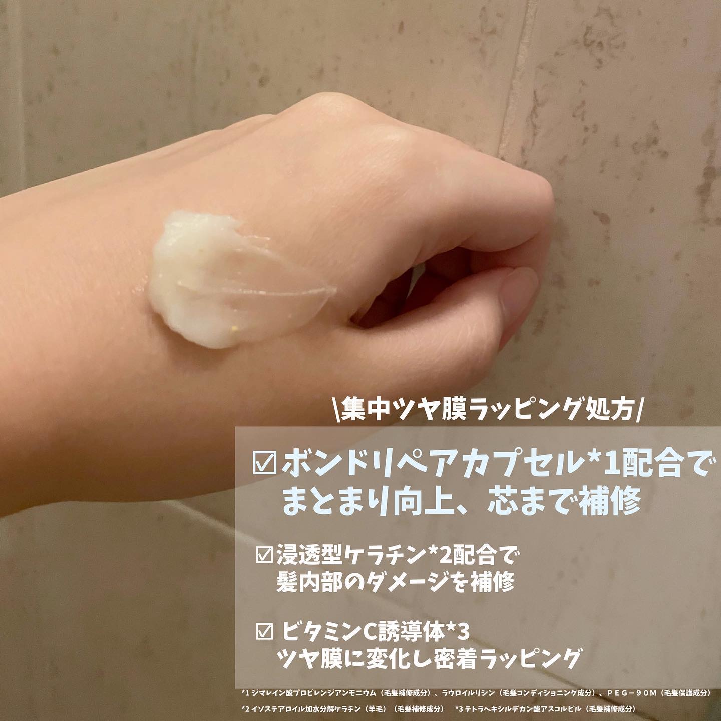 - 傷んだ髪の芯までアプローチ。 深刻なダメージも集中補修し、濃密とろツヤ髪へ導く。 ”集中”ツヤ膜ラッピング処方(浸透型ケラチン※1)で開いたキューティクルから髪内部のダメージを補修。 ビタミンC誘導体※2 でツヤ膜に変化して密着ラッピング。 ダメージ補修しながらカラーをキープ。※3 華やかさとみずみずしさをまとったフルーティブルームの香り。 ※1 イソステアロイル加水分解ケラチン(羊毛)(毛髪補修成分) ※2 テトラヘキシルデカン酸アスコルビル(毛髪補修成分) ※3 コーティング効果による
