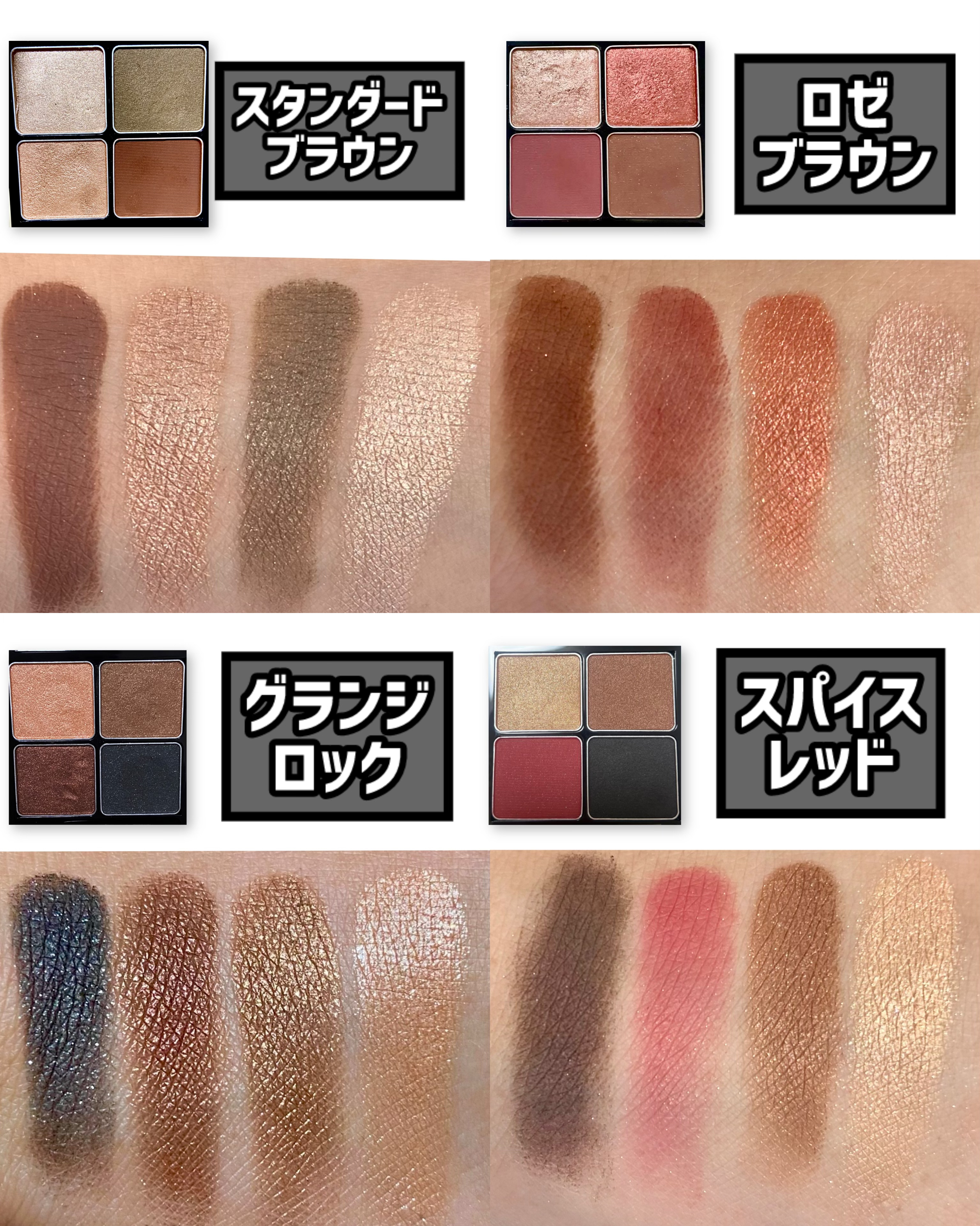 - <カッパーブラウン> ジメチコン、タルク、トリエチルヘキサノイン、イソステアリン酸水添ヒマシ油、リンゴ酸ジイソステアリル、合成フルオロフロゴパイト、ラウリン酸亜鉛、ホウケイ酸(Ca/AI)、シリカ、ポリグリセリル-3ポリジメチルシロキシエチルジメチコン、スクワラン、オリーブ果実油、セラミドNP、ブドウ種子油、ホホバ種子油、トコフェロール、BG、水、セイヨウトチノキ種子エキス、ローズマリー葉エキス、メチルパラベン、酸化鉄、マイカ、酸化チタン <ロゼブラウン> ジメチコン、タルク、合成フルオロフロゴパイト、イソステアリン酸水添ヒマシ油、シリカ、ラウリン酸亜鉛、ホウケイ酸(Ca/AI)、トリエチルヘキサノイン、リンゴ酸ジイソステアリル、スクワラン、オリーブ果実油、セラミドNP、ブドウ種子油、ホホバ種子油、BG、水、トコフェロール、セイヨウトチノキ種子エキス、ローズマリー葉エキス、メチルパラベン、酸化鉄、マイカ、カルミン、酸化チタン、グンジョウ、金 <グラムロック> タルク、ジメチコン、ホウケイ酸(Ca/Al)、リンゴ酸ジイソステアリル、トリエチルヘキサノイン、イソステアリン酸水添ヒマシ油、合成フルオロフロゴパイト、シリカ、ポリグリセリル-3ポリジメチルシロキシエチルジメチコン、ラウリン酸亜鉛、酸化スズ、スクワラン、トコフェロール、オリーブ果実油、セラミドNP、ブドウ種子油、ホホバ種子油、BG、水、セイヨウトチノキ種子エキス、ローズマリー葉エキス、メチルパラベン、マイカ、酸化鉄、酸化チタン、Al、グンジョウ、銀、カルミン、金 <フォーシーズンズ> タルク、トリエチルヘキサノイン、リンゴ酸ジイソステアリル、ホウケイ酸(Ca/Al)、イソステアリン酸水添ヒマシ油、ポリグリセリル-3ポリジメチルシロキシエチルジメチコン、ラウリン酸亜鉛、シリカ、酸化スズ、スクワラン、トコフェロール、オリーブ果実油、セラミドNP、ブドウ種子油、ホホバ種子油、BG、水、セイヨウトチノキ種子エキス、ローズマリー葉エキス、メチルパラベン、マイカ、酸化鉄、酸化チタン、カルミン <スタンダードブラウン> タルク、ジメチコン、トリエチルヘキサノイン、イソステアリン酸水添ヒマシ油、ラウリン酸亜鉛、合成フルオロフロゴパイト、リンゴ酸ジイソステアリル、シリカ、ポリグリセリル―3ポリジメチルシロキシエチルジメチコン、スクワラン、オリーブ果実油、セラミドNP、ブドウ種子油、ホホバ種子油、トコフェロール、BG、水、セイヨウトチノキ種子エキス、ローズマリー葉エキス、メチルパラベン、マイカ、酸化鉄、酸化チタン、赤226 <スパイスレッド> タルク、ジメチコン、合成フルオロフロゴパイト、トリエチルヘキサノイン、リンゴ酸ジイソステアリル、イソステアリン酸水添ヒマシ油、ラウリン酸亜鉛、シリカ、ポリグリセリル―3ポリジメチルシロキシエチルジメチコン、スクワラン、オリーブ果実油、セラミドNP、ブドウ種子油、ホホバ種子油、トコフェロール、BG、水、セイヨウトチノキ種子エキス、ローズマリー葉エキス、メチルパラベン、マイカ、酸化鉄、酸化チタン、赤226、赤202、グンジョウ <グランジロック> タルク、ジメチコン、合成フルオロフロゴパイト、トリエチルヘキサノイン、リンゴ酸ジイソステアリル、イソステアリン酸水添ヒマシ油、ホウケイ酸(Ca/Al)、ポリグリセリル-3ポリジメチルシロキシエチルジメチコン、ラウリン酸亜鉛、シリカ、スクワラン、トコフェロール、オリーブ果実油、セラミドNP、ブドウ種子油、ホホバ種子油、酸化スズ、BG、水、セイヨウトチノキ種子エキス、ローズマリー葉エキス、メチルパラベン、マイカ、酸化鉄、酸化チタン、銀、コンジョウ、金