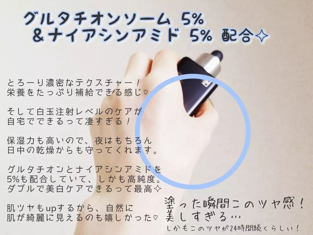 - 高純度99.4%のグルタチオン*を配合し、ハリツヤ肌に導く美容液です。 肌に馴染みやすいリン脂質製のカプセルにグルタチオン成分*を閉じ込め、肌の角質層までうるおいで満たします。 ☑グルタチオンソーム*:50,000ppm ☑ナイアシンアミド* 5%配合 ☑べたつかずしっとりツヤ肌 ☑美顔器AGE-R スキンブースターショットと一緒に使えます 化粧水などでお肌を整えたあと、適量を取り、お肌のキメに沿ってまんべんなく塗った後、やさしくなじませます。 *保湿成分 ■お肌に異常が生じていないかよく注意してご使用ください。化粧品がお肌に合わないとき即ち次のような場合には、使用を中止してください。そのまま使 用を続けますと、症状を悪化させることがありますので、皮膚科専門医等にご相談されることをおすすめします。また、傷やはれもの、しっしん等の異常が ある部位には、ご使用にならないでください。 (1)使用中、赤味、はれ、かゆみ、刺激、色抜け(白斑等)や黒ずみ等の異常があらわれた場合 (2)使用したお肌に、直射日光があたって上記のような異常があらわれた場合 ■目に入らないようご注意ください。目に入ったときは、こすらずにすぐに洗い流してください。その後、目に異物感など異常が残る場合は、眼科専門医へ ご相談されることをおすすめします。 ■極端に高温又は低温の場所、直射日光のあたる場所には保管しないでください。 ■開封後なるべく早めに使用してください。 ■ご使用後はフタをきちんと閉めてください。 ■乳児、子供の手の届かない所に保管してください。