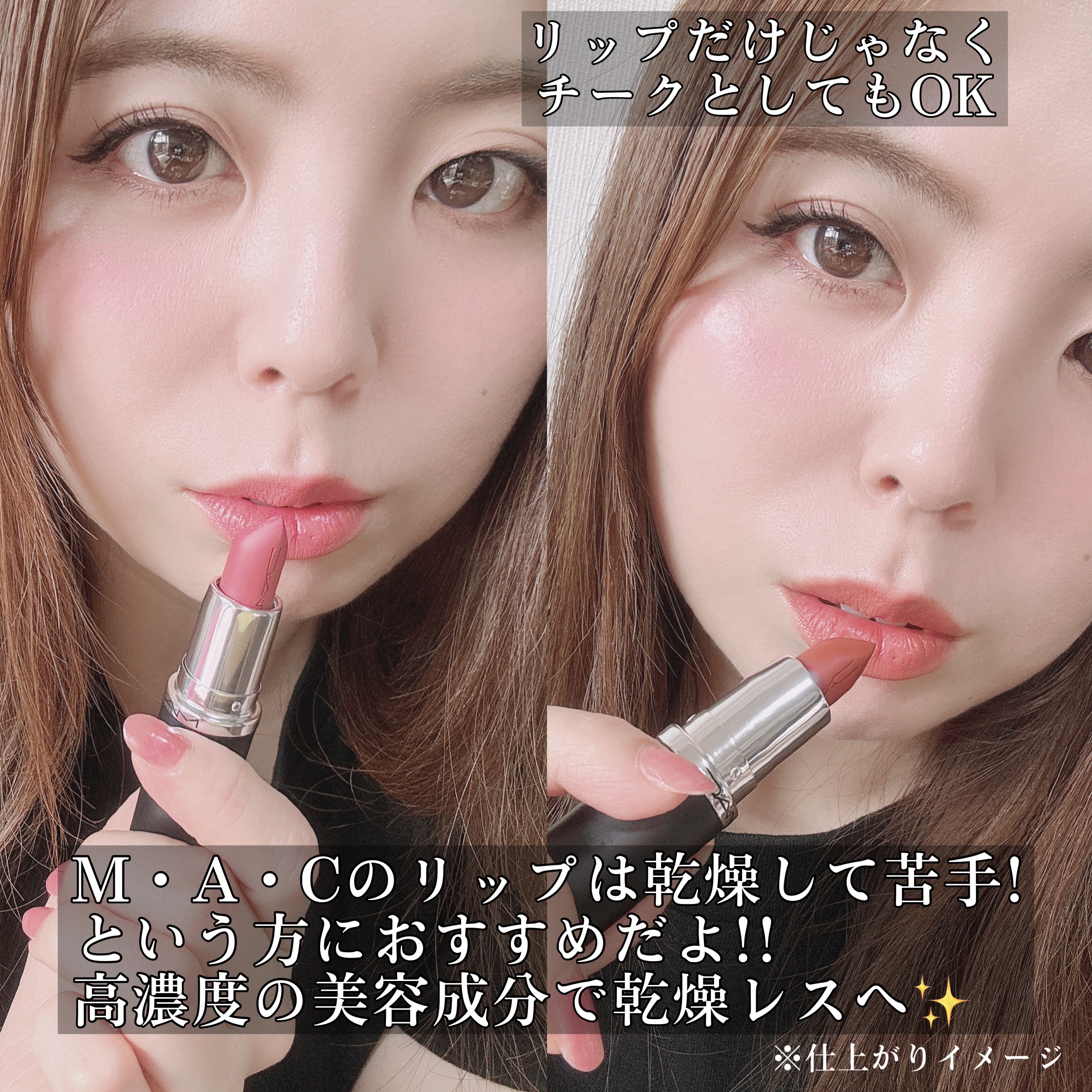 M•A•C史上最高濃度の美容保湿成分inのつやオーラリップ💄 高発色でサテンリップって乾燥しそうなイメージあるけど、これは乾燥を感じにくかったよ! チークにも使えるからとっても便利❣️ ほんわりジュワッとチークになったから、