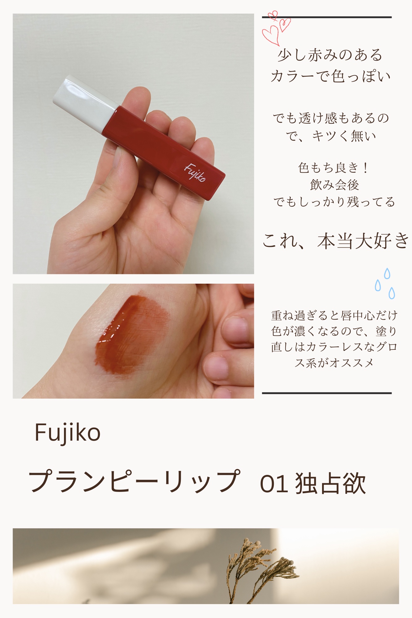 - フジコの新リップは、重ねるほどにパーンと膨んでみえるプランプティント*1。 ぷっくりと存在感のあるリップメイクで唇を主役に。 <プランプ成分(清涼成分)> "メントキシプロパンジオール”採用。 血色感、ボリューム感、クーリング感を演出します。 <オイルウォーターティント処方> 軽やかなオイルが唇に均一に伸び広がり、 FIXING。 時間が経ってもボリューム感と光沢感を演出。 しかもティントだから“落ちにくい”(*2)。 <5種の美容保湿成分配合> アルガンオイル・ツバキ種子油・アーモンド油 ティーツリー葉油・ハチミツエキス *1全てメイクアップ効果 *2効果・効能には個人差があります。