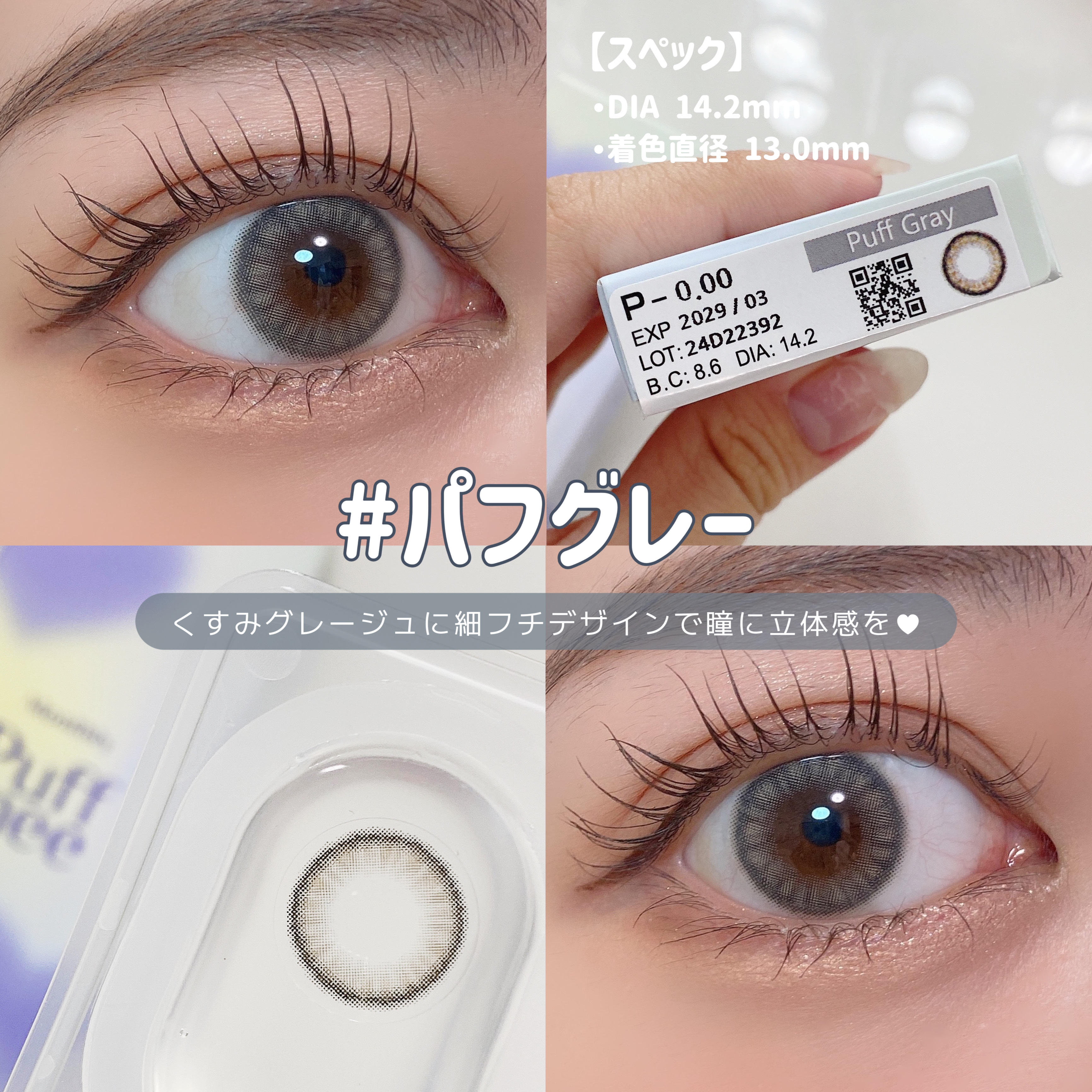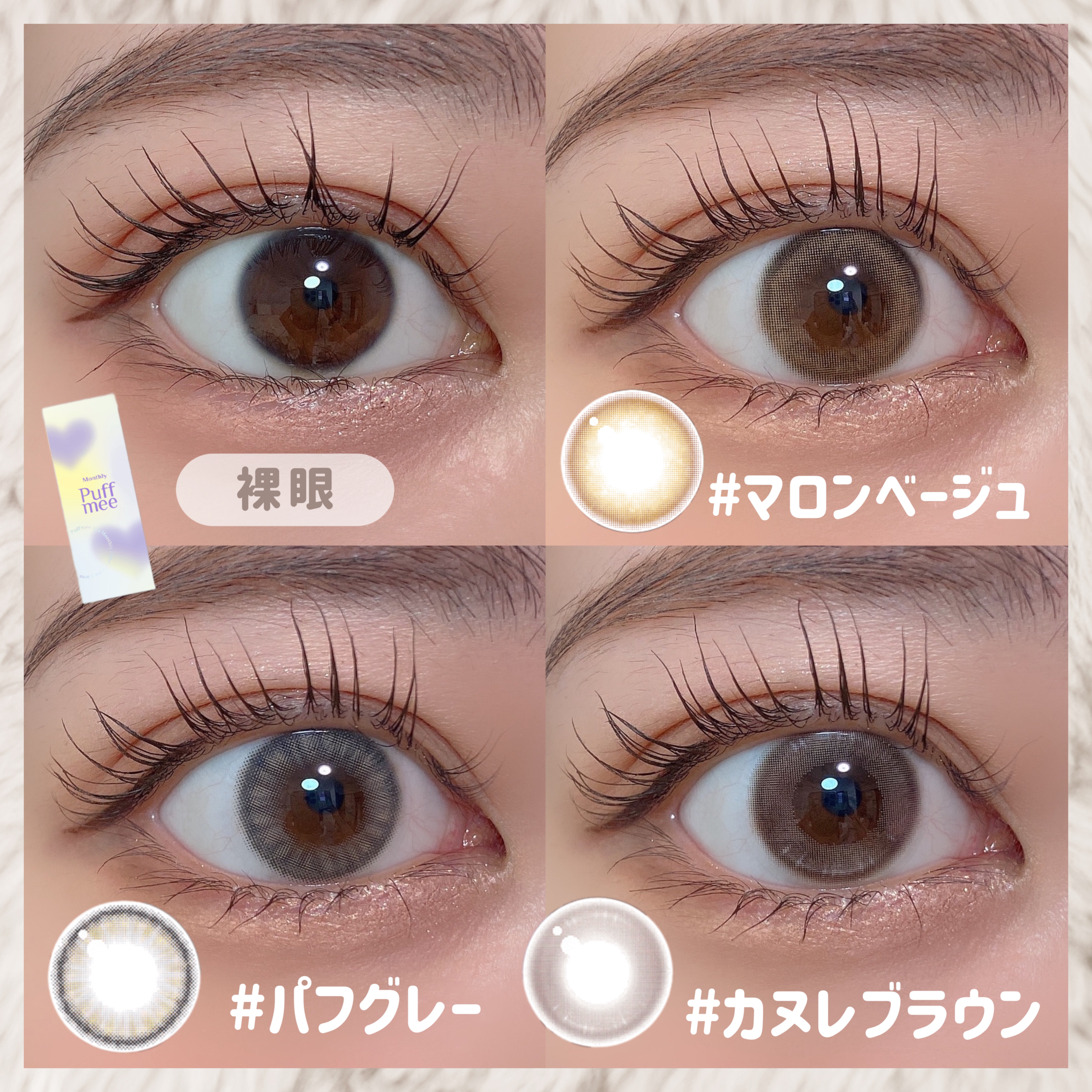 コスパと可愛さにこだわりました♡ Puffmee パフミー WAVEリングシリーズから1monthタイプが登場! 着色直径小さめでデザインも可愛いパフグレー。初心者でも挑戦しやすいグレーカラコン! 明るめカラーが好きならマロンベージュ。色素薄い系の瞳にみせてくれる!