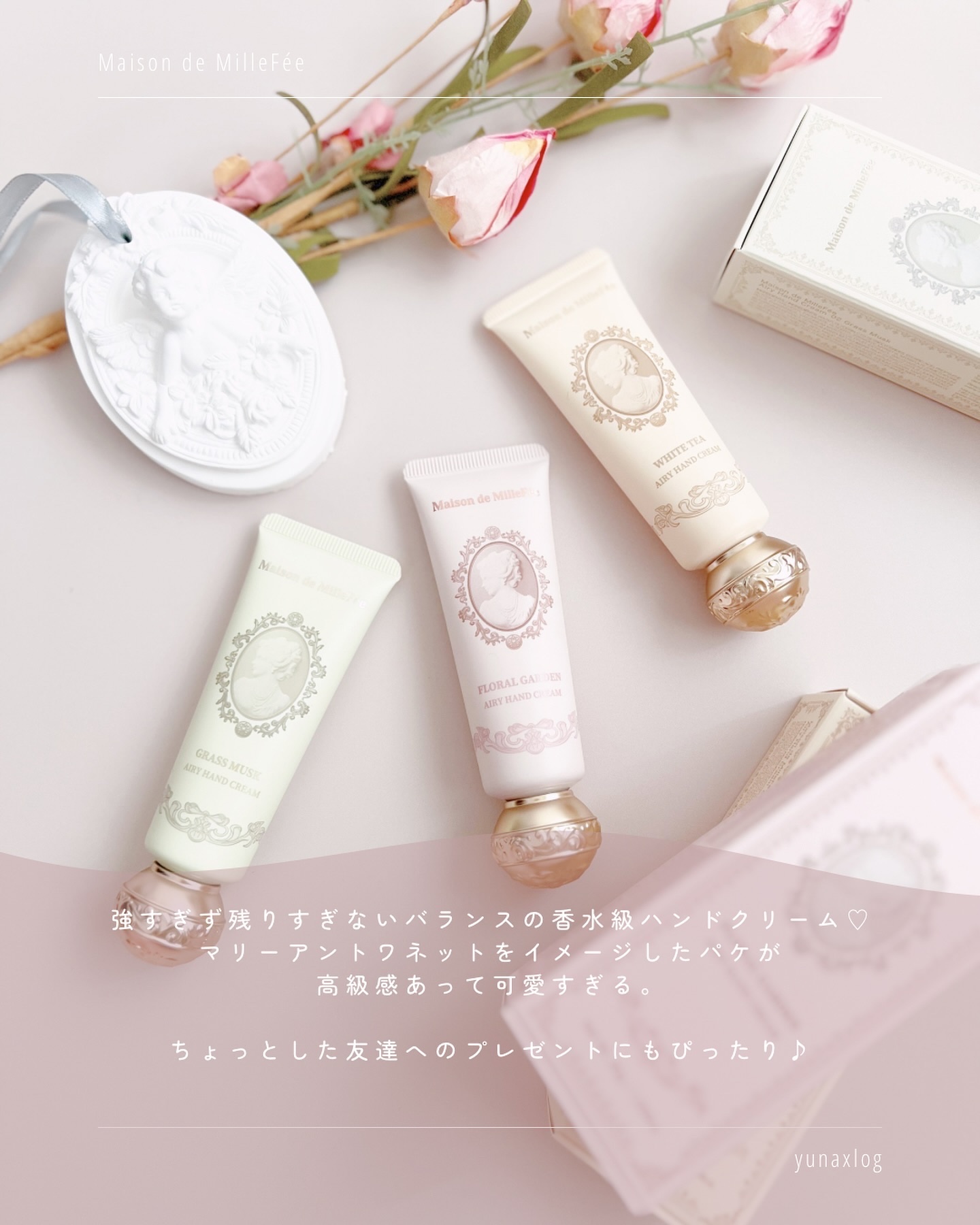 Maison de MilleFée(メゾン ド ミルフィー) エアリーハンドクリーム 香水のようなハンドクリームで、ほんとにどの香りも好きすぎた、、、 マリーアントワネットをイメージしたパケらしくてめっちゃオシャレだし、プレゼント🎁とかにもかなりいいと思います!