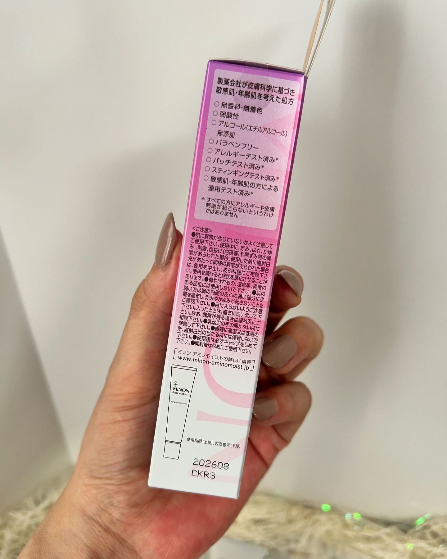 - 【敏感肌も使える薬用シワ改善アイクリーム】 ダブルの有効成分配合。気になるシワを改善し、しみ・そばかす*1、肌あれを防ぎます。 ●ナイアシンアミド:シワ改善&しみ予防 ●グリチルリチン酸2K:肌あれ予防 ハリを与えつや肌に導く「ハリシェイプペプチドWR*2」配合。 使い続けるたび、シワを改善し、うるおってハリのある明るい印象の目元へ。 エイジングケア:年齢に応じたお手入れケア *1メラニンの生成を抑え、しみ・そばかすを防ぐ *2ヤシ油脂肪酸水解コラーゲンK (販売名:ミノンアミノモイストAE)【医薬部外品】