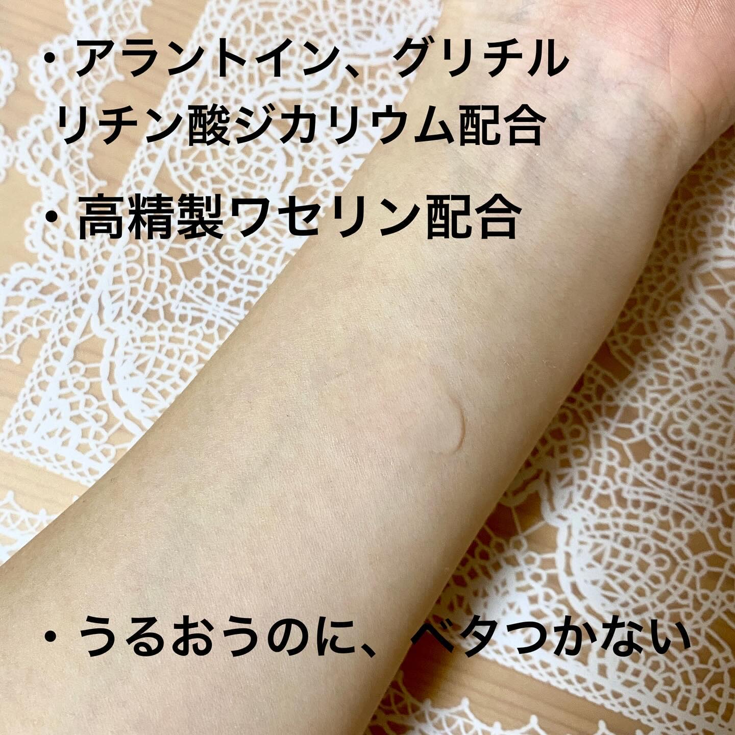 - <薬用ローション(とてもしっとり)> アラントイン、グリチルリチン酸ジカリウム、精製水、1,3-ブチレングリコール、濃グリセリン、ジプロピレングリコール、ポリオキシエチレンメチルグルコシド、ポリオキシエチレン(14)ポリオキシプロピレン(7)ジメチルエーテル、ポリオキシエチレン硬化ヒマシ油、ジイソステアリン酸ポリグリセリル、トリ2-エチルヘキサン酸グリセリル、クエン酸ナトリウム、エリスリトール、クエン酸、メタリン酸ナトリウム、ピロ亜硫酸ナトリウム、L-グルタミン酸ナトリウム、常水、DL-ピロリドンカルボン酸ナトリウム液、ワセリン、塩化カルシウム、塩化マグネシウム、フェノキシエタノール