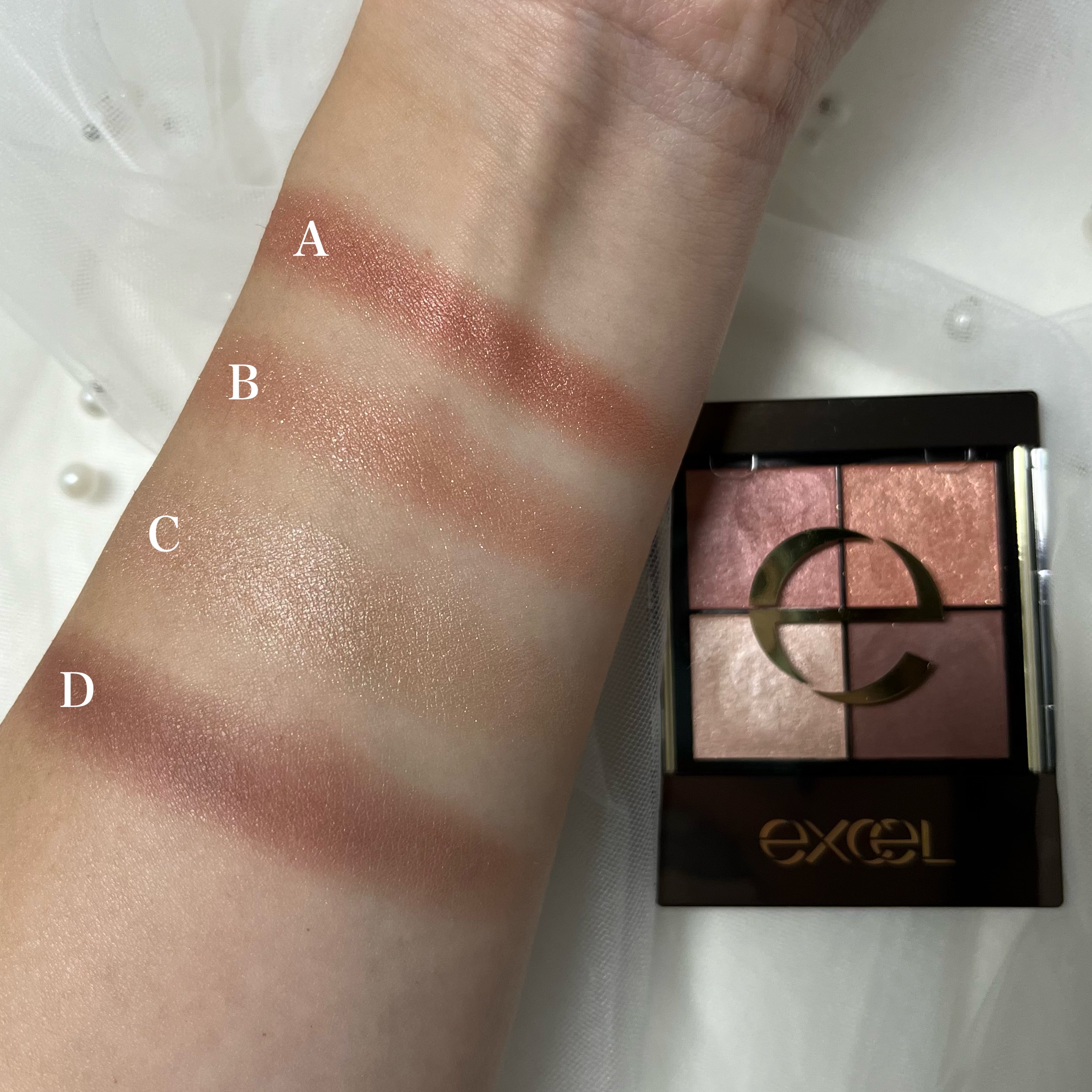 - 1.重ねてもくすまないクリアな発色。ナチュラルに溶け合う絶妙4カラー。 ツヤタイプ(左上・左下カラー):アイホール全体にぼかしたり、目尻へのポイント使いも。 ラメタイプ(右上カラー):アイホール中心や下まぶたにきらめきのアクセント。 マットタイプ(右下カラー):単色で陰影を付けたり、ツヤタイプと重ねてニュアンスをプラス。 2.うっとりするほどリッチな質感で粉飛びしないのに、軽いタッチで伸びて重ねやすいテクスチャー。 3.スクワラン(保湿)配合で目元の乾燥を防ぎます。 [PERFORMANCE] 色と質感の重ね着を楽しむ、ファッション感覚アイシャドウパレット [DESIGN] ・まぶたにひっかからない、なめらかな上質チップ ・薄型コンパクトだからポーチの中でかさばらない [QUALITY] 1.重ねてもくすまないクリアな発色 ナチュラルに溶け合う絶妙4カラー 2.パールの重ね技でまぶたに極上のツヤ感 微細多色 カラーパール 銀コーティング ガラスパール* excel GOLD-MIX処方(金パール配合)* (*右上のシャイニーカラーのみ) 3.うっとりするほどリッチな質感で粉飛び知らず!なのに、軽いタッチで伸びて重ねやすい 4.スクワラン(保湿)配合で目元の乾燥を防ぐ