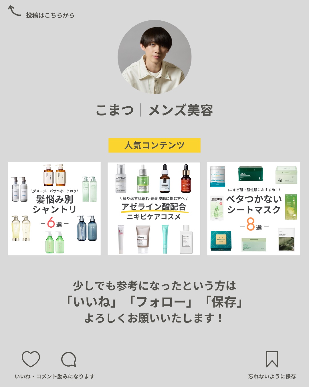 ニキビは日頃の生活習慣や洗顔の方法など様々な要素が原因で現れてしまいます、、! ニキビを早めに対処することはニキビ跡の予防にも繋がります👍 男性だと化粧水と乳液は使うけど、美容液は使わないという方も多いはずなので、投稿を参考にしていただけたらと思います!