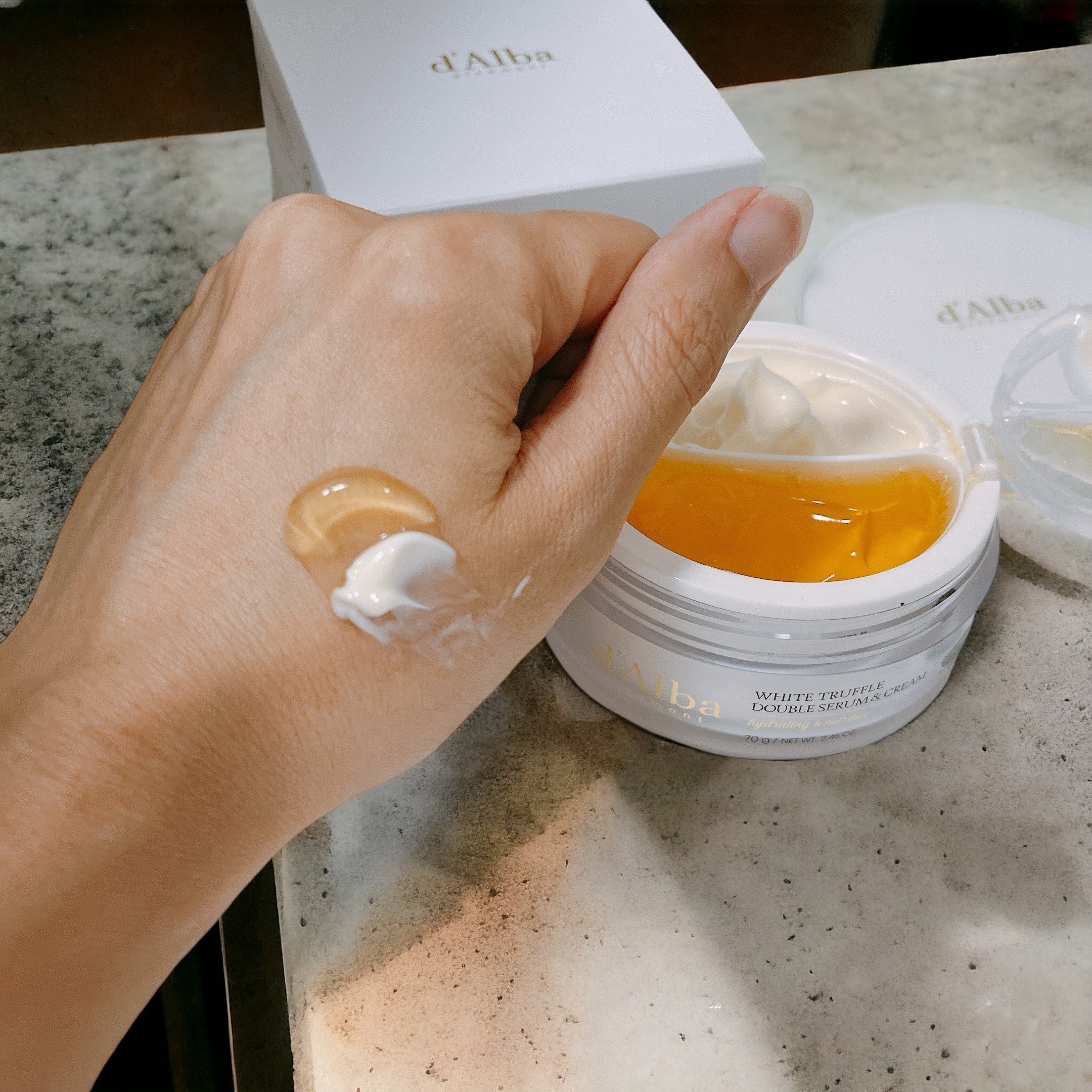 ホワイトトリュフダブルセラムアンドクリーム 使ってみました💕 保湿ケアできるアクアセラムと弾力ケアできるインテンスクリームの2つのクリームを合わせて使います ★アクアセラム:ヒアルロン酸、パンテノール、ツボクサエキス配合。肌に水分を与え肌のキメを整えます。 ★インテンスクリーム:イタリア産ホワイトトリュフ配合。肌にうるおいを与えツヤのあるもち肌へ。