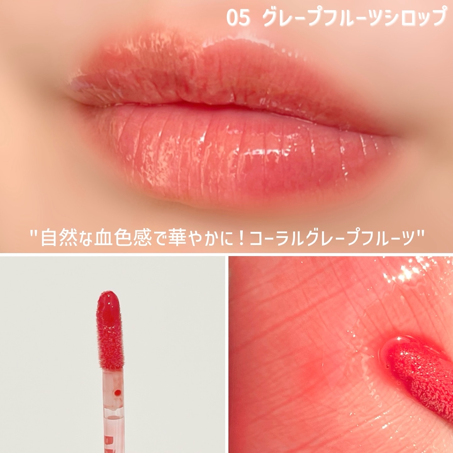 - シロップ光沢溢れる、ぷるぷるオーバーリップを演出 - 想像以上のツヤリップ レイヤリングするほど鮮明なツヤ&シロップカラー演出 -長時間ツヤをキープ 唇のシワを優しい使い心地でカバーし、乾燥しにくく、 しっとりとしたリップ完成 -プランプ効果(メイク効果による) さわやかなプランプ効果でぷるぷるオーバーリップを演出