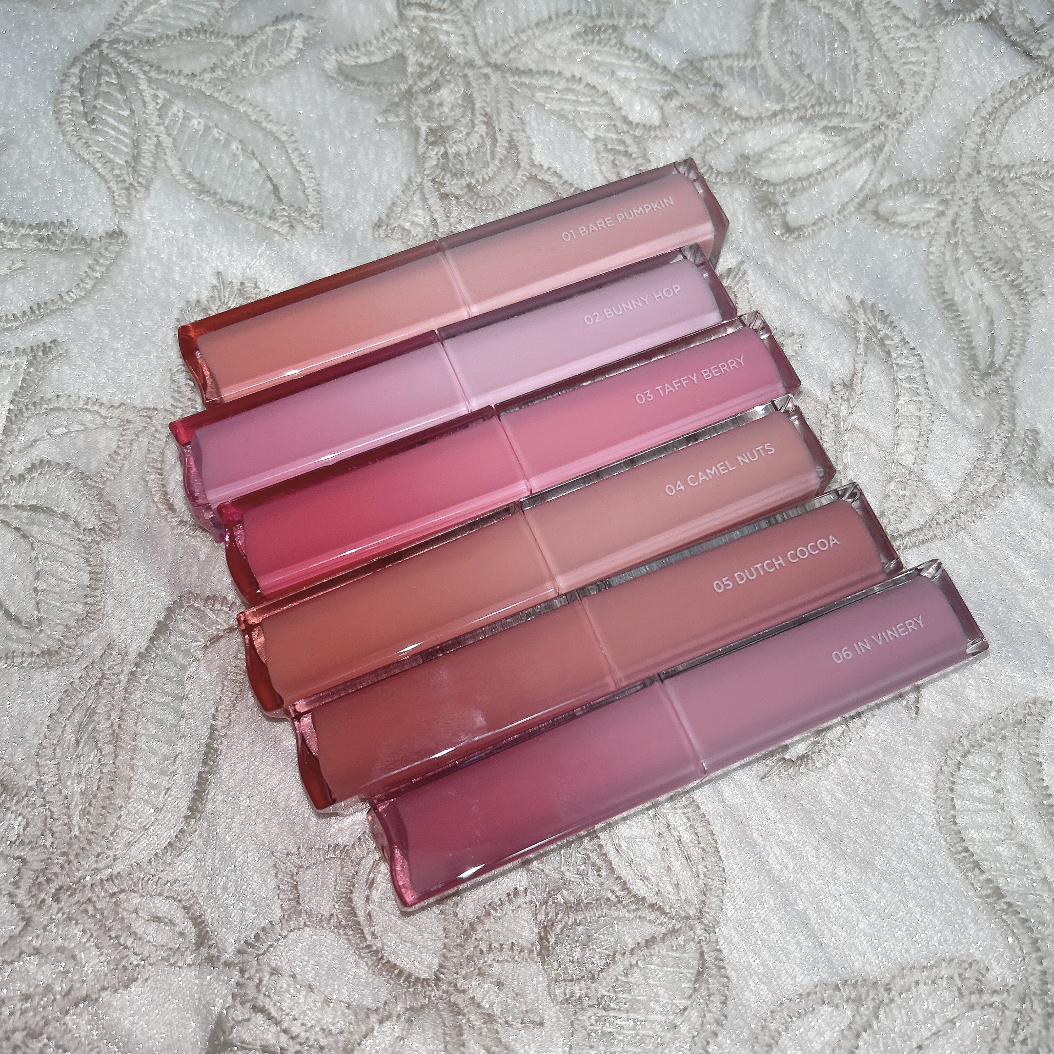 - <01 ベアパンプキン(BARE PUMPKIN)> オクチルドデカノール、ペンタイソステアリン酸ジペンタエリスリチル、ジ安息香酸PG、ヘキサ脂肪酸(C5-9)ジペンタエリスリチルエステルズ、トリ(カプリル酸/カプリン酸)グリセリル、合成ワックス、水添ポリイソブテン、ダイマージリノール酸(フィトステリル/イソステアリル/セチル/ステアリル/ベヘニル)、パラフィン、グリセリン、キャンデリラロウ、フェニルプロピルジメチルシロキシケイ酸、合成フルオロフロゴパイト、水添野菜油、リンゴ酸ジイソステアリル、酸化チタン、イソステアリン酸ソルビタン、ラウリルPEG-9ポリジメチルシロキシエチルジメチコン、アルガニアスピノサ核油、トリ酢酸テトラステアリン酸スクロース、ビニルジメチコン、(セバシン酸/イソパルミチン酸)ジグリセリル、ポリヒドロキシステアリン酸、ジステアルジモニウムヘクトライト、(エチレン/プロピレン)コポリマー、トリイソステアリン酸ポリグリセリル-2、レシチン、マイクロクリスタリンワックス、ポリエチレン、水、パルミチン酸エチルヘキシル、ミリスチン酸イソプロピル、イソステアリン酸、酸化鉄、ステアリン酸ポリグリセリル-10、炭酸プロピレン、ポリリシノレイン酸ポリグリセリル-3、黄5、黄4、1,2-ヘキサンジオール、赤202、ジイソステアリン酸ポリグリセリル-2、赤104(1)、青1、トコフェロール、ハス花エキス、ニンファエアアルバ花エキス、ヤマザクラ花エキス、ハイブリッドローズ花エキス、ソルビン酸K <02 バニーホップ(BUNNY HOP)> オクチルドデカノール、ペンタイソステアリン酸ジペンタエリスリチル、ジ安息香酸PG、ヘキサ脂肪酸(C5-9)ジペンタエリスリチルエステルズ、トリ(カプリル酸/カプリン酸)グリセリル、合成ワックス、水添ポリイソブテン、ダイマージリノール酸(フィトステリル/イソステアリル/セチル/ステアリル/ベヘニル)、パラフィン、グリセリン、リンゴ酸ジイソステアリル、キャンデリラロウ、フェニルプロピルジメチルシロキシケイ酸、合成フルオロフロゴパイト、酸化チタン、水添野菜油、イソステアリン酸ソルビタン、ラウリルPEG-9ポリジメチルシロキシエチルジメチコン、アルガニアスピノサ核油、トリ酢酸テトラステアリン酸スクロース、ビニルジメチコン、(セバシン酸/イソパルミチン酸)ジグリセリル、ポリヒドロキシステアリン酸、ジステアルジモニウムヘクトライト、(エチレン/プロピレン)コポリマー、トリイソステアリン酸ポリグリセリル-2、マイクロクリスタリンワックス、レシチン、ポリエチレン、水、パルミチン酸エチルヘキシル、ミリスチン酸イソプロピル、イソステアリン酸、ステアリン酸ポリグリセリル-10、酸化鉄、炭酸プロピレン、黄4、ポリリシノレイン酸ポリグリセリル-3、赤227、1,2-ヘキサンジオール、赤202、黄5、ジイソステアリン酸ポリグリセリル-2、青1、トコフェロール、ハス花エキス、ニンファエアアルバ花エキス、ヤマザクラ花エキス、ハイブリッドローズ花エキス、ソルビン酸K <03 タフィーベリー(TAFFY BERRY)> オクチルドデカノール、ペンタイソステアリン酸ジペンタエリスリチル、ジ安息香酸PG、ヘキサ脂肪酸(C5-9)ジペンタエリスリチルエステルズ、トリ(カプリル酸/カプリン酸)グリセリル、合成ワックス、水添ポリイソブテン、ダイマージリノール酸(フィトステリル/イソステアリル/セチル/ステアリル/ベヘニル)、パラフィン、グリセリン、キャンデリラロウ、フェニルプロピルジメチルシロキシケイ酸、合成フルオロフロゴパイト、水添野菜油、リンゴ酸ジイソステアリル、酸化チタン、イソステアリン酸ソルビタン、ラウリルPEG-9ポリジメチルシロキシエチルジメチコン、アルガニアスピノサ核油、トリ酢酸テトラステアリン酸スクロース、ビニルジメチコン、(セバシン酸/イソパルミチン酸)ジグリセリル、トリイソステアリン酸ポリグリセリル-2、ポリヒドロキシステアリン酸、ジステアルジモニウムヘクトライト、(エチレン/プロピレン)コポリマー、黄4、マイクロクリスタリンワックス、レシチン、ポリエチレン、水、パルミチン酸エチルヘキシル、ミリスチン酸イソプロピル、イソステアリン酸、ステアリン酸ポリグリセリル-10、酸化鉄、炭酸プロピレン、赤202、赤227、ポリリシノレイン酸ポリグリセリル-3、ジイソステアリン酸ポリグリセリル-2、1,2-ヘキサンジオール、黄5、トコフェロール、ハス花エキス、ニンファエアアルバ花エキス、ヤマザクラ花エキス、ハイブリッドローズ花エキス、ソルビン酸K <04 キャメルナッツ(CAMEL NUTS)> オクチルドデカノール、ペンタイソステアリン酸ジペンタエリスリチル、ジ安息香酸PG、ヘキサ脂肪酸(C5-9)ジペンタエリスリチルエステルズ、トリ(カプリル酸/カプリン酸)グリセリル、合成ワックス、水添ポリイソブテン、ダイマージリノール酸(フィトステリル/イソステアリル/セチル/ステアリル/ベヘニル)、パラフィン、グリセリン、リンゴ酸ジイソステアリル、キャンデリラロウ