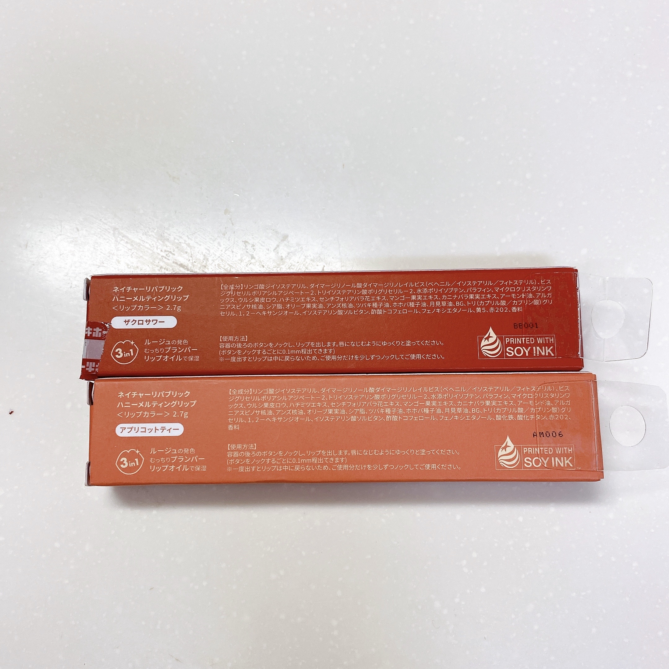 - <01 アプリコットティー> リンゴ酸ジイソステアリル、ダイマージリノール酸ダイマージリノレイルビス(ベヘニル/イソステアリル/フィトステリル)、ビスジグリセリルポリアシルアジペート-2、トリイソステアリン酸ポリグリセリル-2、水添ポリイソブテン、パラフィン、マイクロクリスタリンワックス、ウルシ果皮ロウ、ハチミツエキス、センチフォリアバラ花エキス、マンゴー果実エキス、カニナバラ果実エキス、アーモンド油、アルガニアスピノサ核油、アンズ核油、オリーブ果実油、シア脂、ツバキ種子油、ホホバ種子油、月見草油、BG、トリ(カプリル酸/カプリン酸)グリセリル、1,2-ヘキサンジオール、イソステアリン酸ソルビタン、酢酸トコフェロール、フェノキシエタノール、酸化鉄、酸化チタン、赤202、香料 <02 イチジクミルク> リンゴ酸ジイソステアリル、ダイマージリノール酸ダイマージリノレイルビス(ベヘニル/イソステアリル/フィトステリル)、ビスジグリセリルポリアシルアジペート-2、トリイソステアリン酸ポリグリセリル-2、水添ポリイソブテン、パラフィン、マイクロクリスタリンワックス、ウルシ果皮ロウ、ハチミツエキス、センチフォリアバラ花エキス、マンゴー果実エキス、カニナバラ果実エキス、アーモンド油、アルガニアスピノサ核油、シア脂、オリーブ果実油、アンズ核油、ツバキ種子油、ホホバ種子油、月見草油、BG、トリ(カプリル酸/カプリン酸)グリセリル、1,2-ヘキサンジオール、イソステアリン酸ソルビタン、酢酸トコフェロール、フェノキシエタノール、酸化鉄、酸化チタン、赤202、青1、香料 <03 ベリーヨーグルト> リンゴ酸ジイソステアリル、ダイマージリノール酸ダイマージリノレイルビス(ベヘニル/イソステアリル/フィトステリル)、ビスジグリセリルポリアシルアジペート-2、トリイソステアリン酸ポリグリセリル-2、水添ポリイソブテン、パラフィン、マイクロクリスタリンワックス、ウルシ果皮ロウ、ハチミツエキス、センチフォリアバラ花エキス、マンゴー果実エキス、カニナバラ果実エキス、アーモンド油、アルガニアスピノサ核油、シア脂、オリーブ果実油、アンズ核油、ツバキ種子油、ホホバ種子油、月見草油、BG、トリ(カプリル酸/カプリン酸)グリセリル、1,2-ヘキサンジオール、イソステアリン酸ソルビタン、酢酸トコフェロール、フェノキシエタノール、酸化鉄、酸化チタン、赤202、黄5、香料 <04 ザクロサワー> リンゴ酸ジイソステアリル、ダイマージリノール酸ダイマージリノレイルビス(ベヘニル/イソステアリル/フィトステリル)、ビスジグリセリルポリアシルアジペート-2、トリイソステアリン酸ポリグリセリル-2、水添ポリイソブテン、パラフィン、マイクロクリスタリンワックス、ウルシ果皮ロウ、ハチミツエキス、センチフォリアバラ花エキス、マンゴー果実エキス、カニナバラ果実エキス、アーモンド油、アルガニアスピノサ核油、シア脂、オリーブ果実油、アンズ核油、ツバキ種子油、ホホバ種子油、月見草油、BG、トリ(カプリル酸/カプリン酸)グリセリル、1,2-ヘキサンジオール、イソステアリン酸ソルビタン、酢酸トコフェロール、フェノキシエタノール、黄5、赤202、香料 <05 プラムワイン> リンゴ酸ジイソステアリル、ダイマージリノール酸ダイマージリノレイルビス(ベヘニル/イソステアリル/フィトステリル)、ビスジグリセリルポリアシルアジペート-2、トリイソステアリン酸ポリグリセリル-2、水添ポリイソブテン、パラフィン、マイクロクリスタリンワックス、ウルシ果皮ロウ、ハチミツエキス、センチフォリアバラ花エキス、マンゴー果実エキス、カニナバラ果実エキス、アーモンド油、アルガニアスピノサ核油、シア脂、オリーブ果実油、アンズ核油、ツバキ種子油、ホホバ種子油、月見草油、BG、トリ(カプリル酸/カプリン酸)グリセリル、1,2-ヘキサンジオール、イソステアリン酸ソルビタン、酢酸トコフェロール、フェノキシエタノール、酸化鉄、赤202、青1、香料 <06 チャイミルクティー> リンゴ酸ジイソステアリル、ダイマージリノール酸ダイマージリノレイルビス(ベヘニル/イソステアリル/フィトステリル)、ビスジグリセリルポリアシルアジペート-2、トリイソステアリン酸ポリグリセリル-2、水添ポリイソブテン、パラフィン、マイクロクリスタリンワックス、ハチミツエキス、センチフォリアバラ花エキス、マンゴー果実エキス、カニナバラ果実エキス、アーモンド油、アルガニアスピノサ核油、シア脂、オリーブ果実油、アンズ核油、ツバキ種子油、ホホバ種子油、月見草油、BG、トリ(カプリル酸/カプリン酸)グリセリル、水、1,2-ヘキサンジオール、イソステアリン酸ソルビタン、BHT、酢酸トコフェロール、フェノキシエタノール、酸化チタン、酸化鉄、香料 <21 ダーティチョコ> リンゴ酸ジイソステアリル、ダイマージリノール酸ダイマージリノレイルビス(ベヘニル/イソステアリル/フィトステリル)、ビスジグリセリルポリアシル