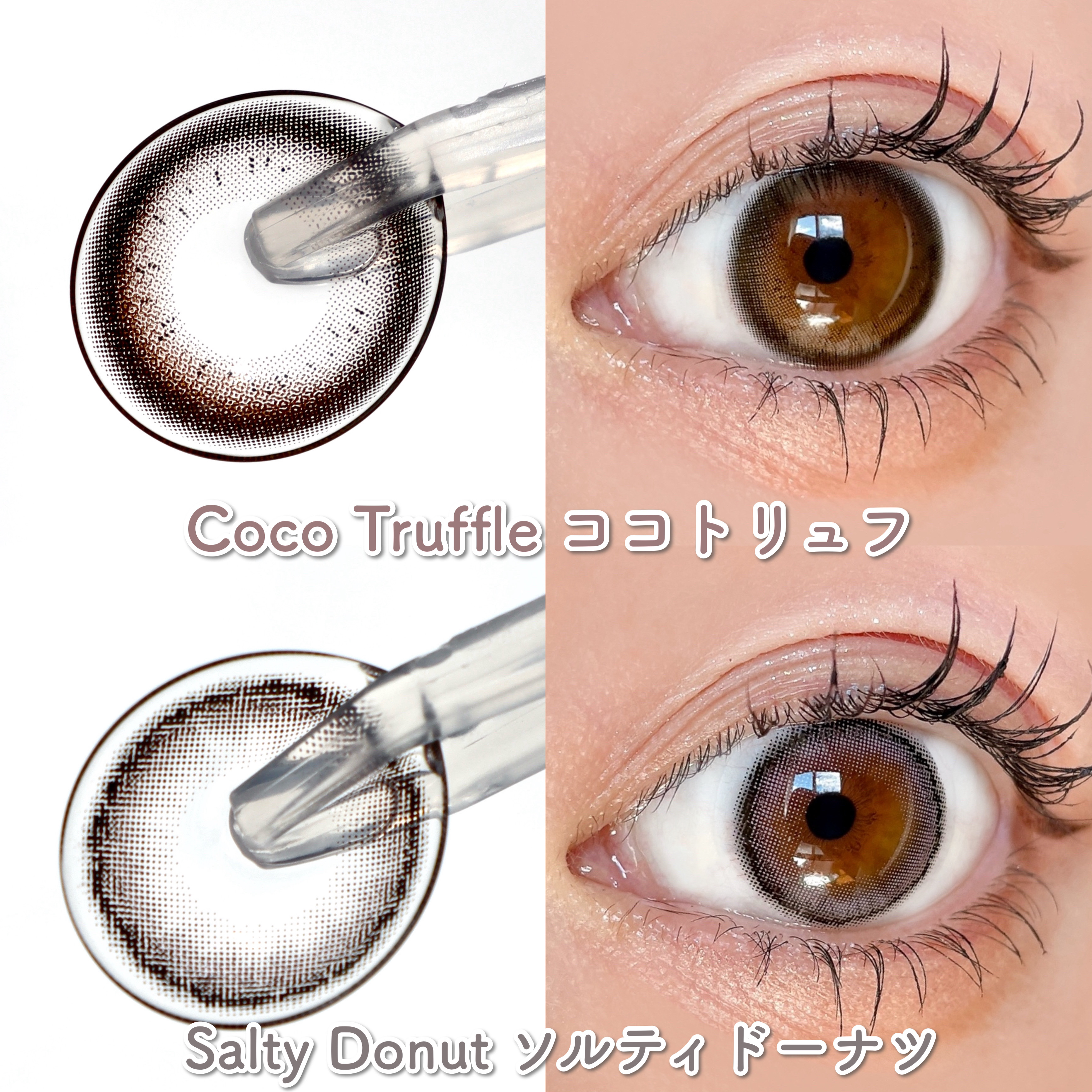 ココトリュフ 太フチの水光レンズで見たときは「私、宇宙人になってしまうかも…」と心配したけどブラウン部分がナチュラルな色味なので太フチも強調されすぎず ソルティドーナツ 今までありそうでなかった色味ほんのりピンクを忍ばせた絶妙グレーレンズ グレーも白すぎず暗すぎずでラベンダーっぽくも見えて 自分の好きなメイクに合いそうなレンズ