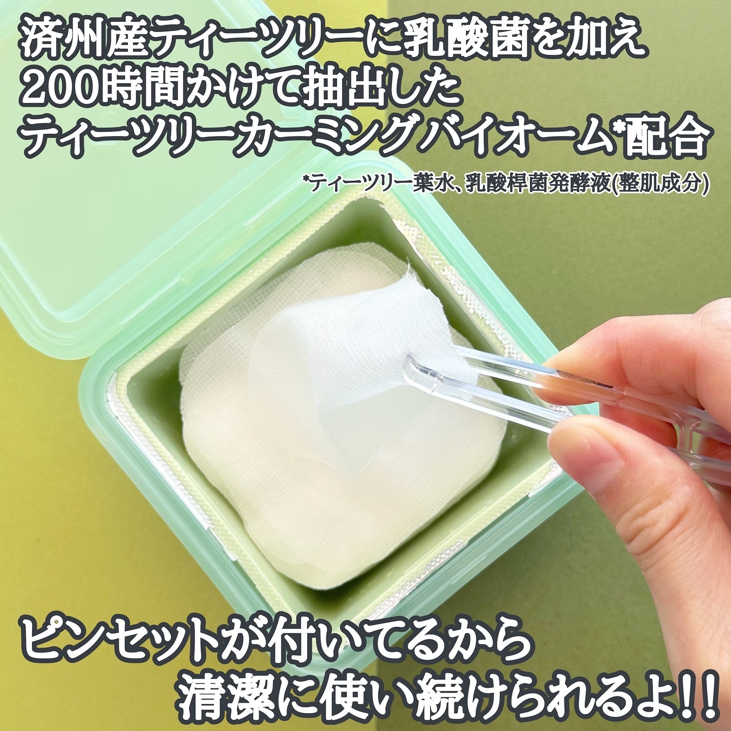 - 1日の始まりと終わりのケアに。 お肌に合わせて選べる100入りトナーパッド4種 肌荒れ防止ケアエッセンスをたっぷり含んだ、カーゼ素材のパッドでなめらかな肌へとケアします。 済州産ティーツリーに乳酸菌を加え、200時間抽出したティーツリーカーミングバイオーム配合。 べたつかない爽やかな使い心地のトナーパッドです。 ■67mmスクエアパッド 大きく四角いパッドが肌にぴったりと密着。拭き取りパッド・パックとしてご使用いただけます。 最後の1枚まで衛生的に使用できるピンセット付。