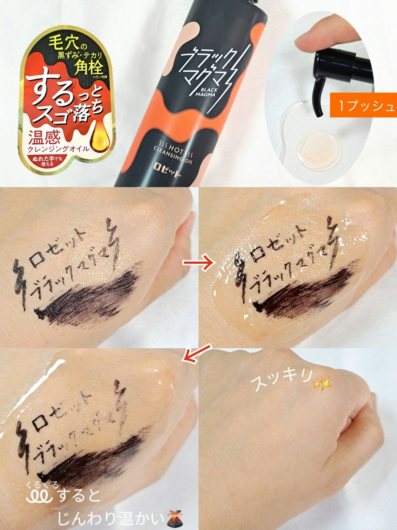 - ・温感オイル×ミネラルパウダー*5× 美容成分*4でメイクを落としながらしっかり毛穴ケア! *4 ノイバラ果実エキス、アーチチョーク葉エキス、ユキノシタエキス、ショウガ根エキス[保湿成分] *5 溶岩末、火山土、炭、モロッコ溶岩クレイ、タナクラクレイ、カオリン[清浄成分] 肌にのばすと瞬時に“温感”を感じるオイルタイプのクレンジング。オレンジ色のオイルは煮えたぎるように熱いマグマを表現しています。 ■するっと!角栓ディープクリア処方 マグマのような温感オイルがじんわり肌をほぐしながら、メイクに素早くなじみ、毛穴汚れや角栓を溶かします。さらに、ミネラルパウダー*5がしつこい毛穴の黒ずみ*3、皮脂汚れを吸着してかき出します。 *3 古い角質 *5 溶岩末、火山土、炭、モロッコ溶岩クレイ、タナクラクレイ、カオリン[清浄成分] ■毛穴汚れ・ざらつきにアプローチするミネラルパウダー*5配合! マグマに由来する溶岩末*1、火山土*1のほか、炭*1、吸着クレイ*2といったミネラルパウダーを配合。気になる毛穴の汚れやざらつき・角栓にアプローチしてしっかり除去します。 *1 清浄成分 *2 モロッコ溶岩クレイ、タナクラクレイ、カオリン[清浄成分] *5 溶岩末、火山土、炭、モロッコ溶岩クレイ、タナクラクレイ、カオリン[清浄成分] ■毛穴の目立たないつるすべ肌*6へ導く美容成分*4配合! 植物由来の美容成分*4配合で、肌のキメを整え、毛穴の目立たないつるすべ肌*6へ。 *4 ノイバラ果実エキス、アーチチョーク葉エキス、ユキノシタエキス、ショウガ根エキス[保湿成分] *6 うるおいによる肌印象 ■W洗顔不要 ■マツエクO K ■ぬれた手O K ■マグマをイメージしたデザイン パッケージ・ビジュアルは、力強さを表現するブラックをベースに、熱いマグマがどろっと流れるイメージをデザインしています。