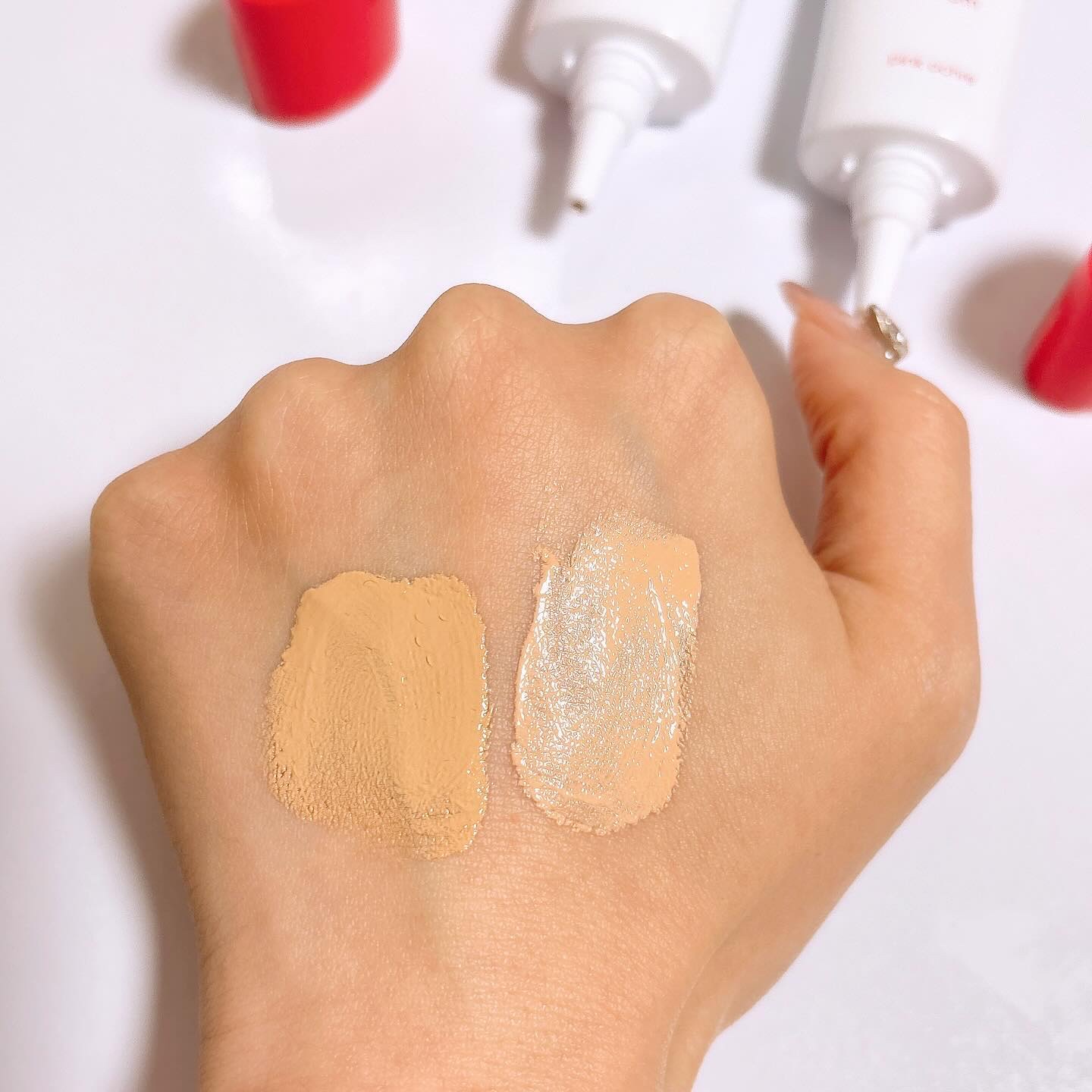 - <オークル> 水、シクロペンタシロキサン、BG、トリエチルヘキサノイン、PEG-10ジメチコン、グリセリン、(HDI/トリメチロールへキシルラクトン)クロスポリマー、カプリリルメチコン、トリメチルシロキシケイ酸、ソルビトール、シルク、セリシン、加水分解シルク、加水分解コラーゲン、水溶性コラーゲン、水溶性コラーゲンクロスポリマー、ヒアルロン酸Na、グリチルリチン酸2K、ローズマリー葉油、PEG/PPG/ポリブチレングリコール-8/5/3グリセリン、ペンチレングリコール、ジメチコン、メタクリル酸メチルクロスポリマー、硫酸Mg、シリカ、ジステアルジモニウムヘクトライト、PEG-9ジメチコン、クエン酸Na、トコフェロール、トリエトキシカプリリルシラン、ハイドロゲンジメチコン、酸化亜鉛、酸化チタン、合成フルオロフロゴパイト、酸化鉄、水酸化Al、フェノキシエタノール <ピンクオークル> 水、シクロペンタシロキサン、BG、トリエチルヘキサノイン、PEG-10ジメチコン、グリセリン、(HDI/トリメチロールへキシルラクトン)クロスポリマー、カプリリルメチコン、トリメチルシロキシケイ酸、ソルビトール、シルク、セリシン、加水分解シルク、加水分解コラーゲン、水溶性コラーゲン、水溶性コラーゲンクロスポリマー、ヒアルロン酸Na、グリチルリチン酸2K、ローズマリー葉油、PEG/PPG/ポリブチレングリコール-8/5/3グリセリン、ペンチレングリコール、ジメチコン、メタクリル酸メチルクロスポリマー、硫酸Mg、シリカ、ジステアルジモニウムヘクトライト、PEG-9ジメチコン、クエン酸Na、トコフェロール、トリエトキシカプリリルシラン、ハイドロゲンジメチコン、酸化亜鉛、酸化チタン、合成フルオロフロゴパイト、酸化鉄、水酸化Al、フェノキシエタノール