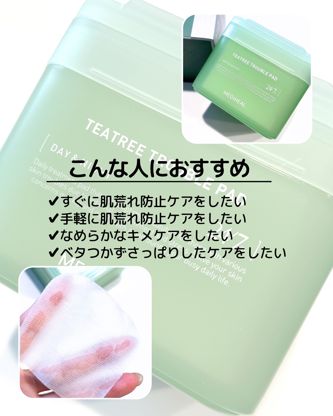 メディヒール独占成分 ティーツリーカーミングバイオーム*で敏感になった肌を集中的にケア! トナーパッドとしてはもちろん 部分パック・ピーリング(拭き取りによる)とマルチに使えるよ👌🏻 みずみずしくさっぱりとしたテクスチャー💚 柔らかなガーゼ素材が使いやすい🫶🏻