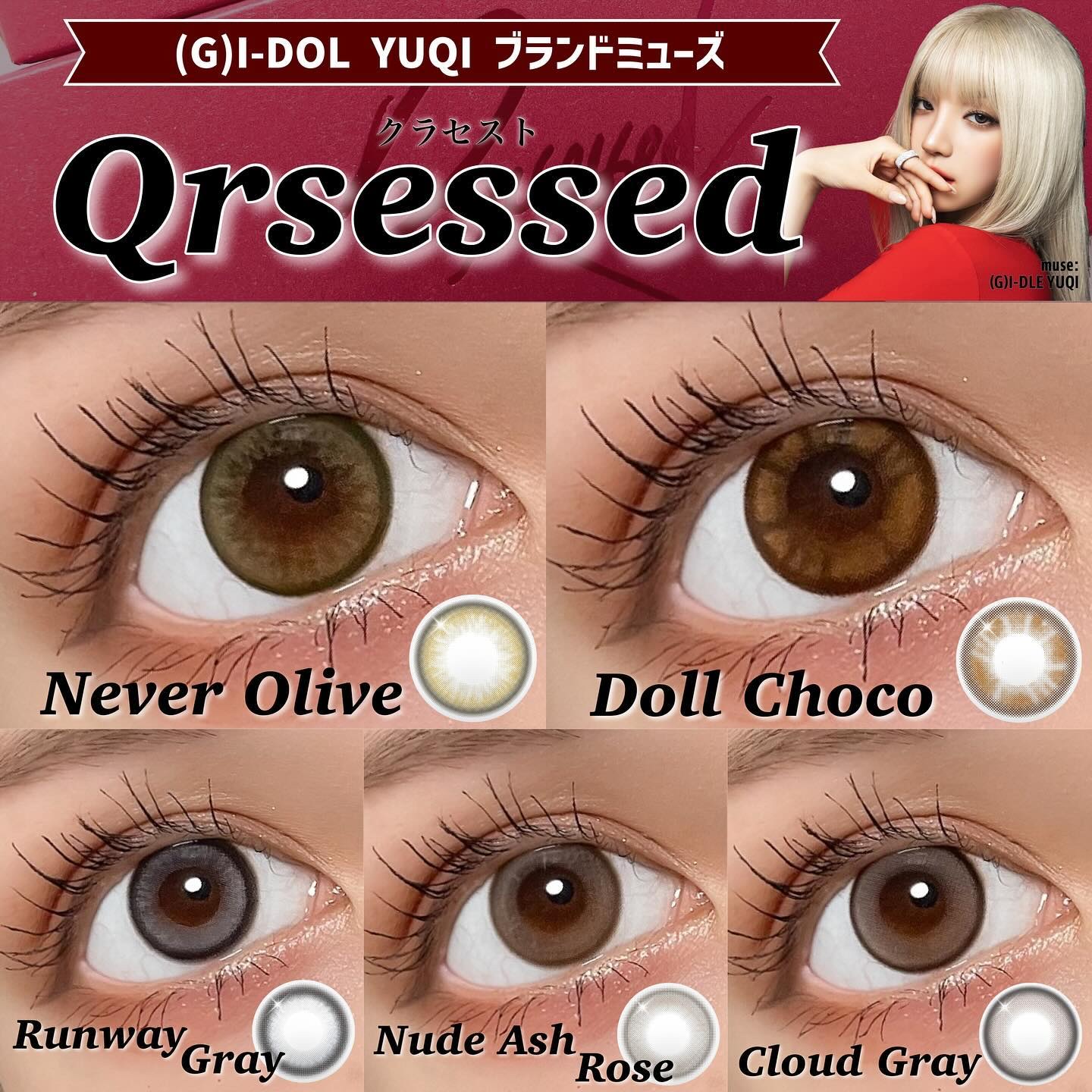 (G)I-DLE YUQIミューズの新カラコンブランド〖Qrsessed -クラセスト-〗。最新の韓国トレンドを盛り込んだ全5色のラインナップです✦˖ 理想の虹彩を表現する3トーンのオリーブカラー。ほんの少しくすんだ、だけど透明感のあるオリーブが絶妙...!✧˖ おしゃれでどこか大胆で、つけていると不思議と強さと自信が湧いてくるようなカラコン...!💫