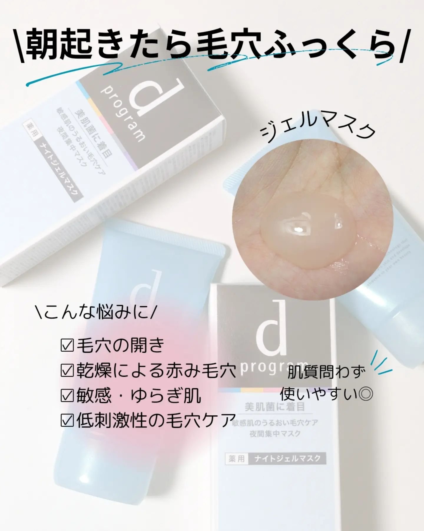 - 塗って寝ている間に集中アプローチ。 毛穴の目立たないつるんとなめらか美肌に導く薬用ナイトジェルマスク 誰の肌にも存在し、美しい肌の鍵である美肌菌に着目したd プログラム。 塗って寝ている間に集中アプローチ。 うるおって毛穴の目立たない「なめらか美肌」に導く薬用ナイトジェルマスク。 毛穴周りの肌にうるおいを与え続け、きめを整え毛穴の目立たない肌に導きます。 美容成分ブナエキスGL(ブナエキス、グリセリン/保湿)。 ●厳選成分配合、クリーン製法 ●パラベン(防腐剤)フリー、アルコール(エチルアルコール)フリー ●無香料、無着色、弱酸性 ●低刺激設計。敏感肌の方のご協力によるパッチテスト済み* ●スティンギングテスト済み* *すべての方にアレルギーや皮ふ刺激がおきないわけではありません。 <使用方法> ●週2~3回を目安に、夜のお手入れの最後にお使いください。 ●手のひらに直径約2cmの円を目安にとり、両ほおにたっぷり塗り広げた後、顔全体にのばします。 ●肌を覆ったまま触れずにしばらく待つと、ジェルが肌になじんでいきます。 洗い流し不要で、そのままおやすみいただけます。(なじむ時間には個人差があります。)