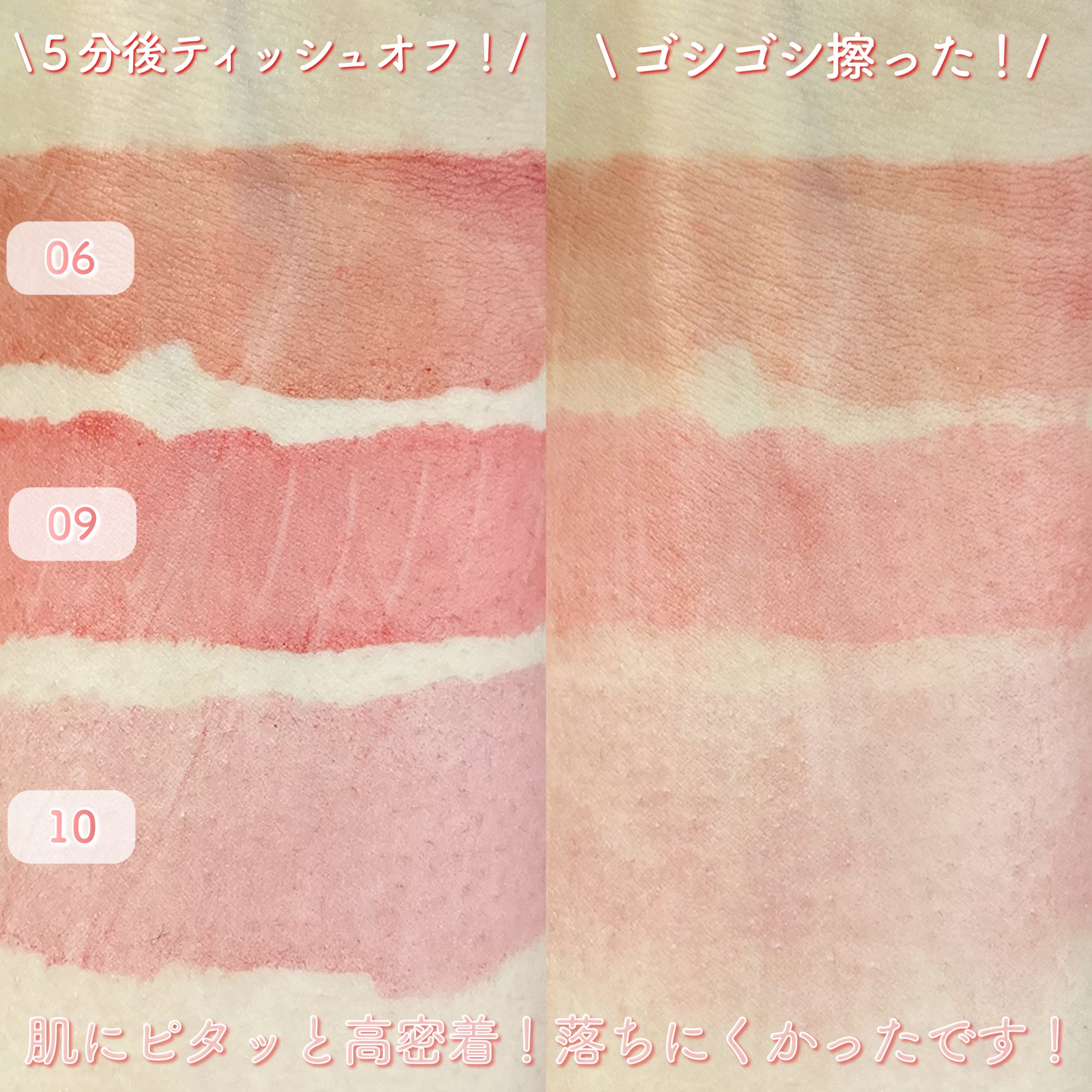 - <01 エロディー> 水、グリセリン、DPG、テトラエチルヘキサン酸ペンタエリスリチル、ダイマージリノール酸水添ヒマシ油、ジイソステアリン酸ポリグリセリル-3、ステアリン酸グリセリル(SE)、ステアリン酸ソルビタン、(アクリロイルジメチルタウリンアンモニウム/VP)コポリマー、水添ポリシクロペンタジエン、リンゴ酸ジイソステアリル、酸化チタン、ステアリン酸PEG-100、テトライソステアリン酸ペンタエリスリチル、(アクリル酸Na/アクリロイルジメチルタウリンNa)コポリマー、ラウリン酸ヘキシル、クロルフェネシン、カプリリルグリコール、エチルヘキシルグリセリン、イソヘキサデカン、香料、ヤシ脂肪酸スクロース、BG、ジヒドロキシアセトン、ジメチコン、キイチゴエキス、黄5、ポリソルベート80、赤102、トロポロン、1,2-ヘキサンジオール、赤227、ヒアルロン酸Na、EDTA-2Na、黄4、カニナバラ果実油、アンズ核油、青1 <02 リル> 水、グリセリン、DPG、テトラエチルヘキサン酸ペンタエリスリチル、ダイマージリノール酸水添ヒマシ油、ジイソステアリン酸ポリグリセリル-3、ステアリン酸グリセリル(SE)、ステアリン酸ソルビタン、(アクリロイルジメチルタウリンアンモニウム/VP)コポリマー、(VP/ヘキサデセン)コポリマー、ジヒドロキシアセトン、スクワラン、水添ポリシクロペンタジエン、ステアリン酸PEG-100、(アクリル酸Na/アクリロイルジメチルタウリンNa)コポリマー、フェノキシエタノール、クロルフェネシン、イソヘキサデカン、リンゴ酸ジイソステアリル、酸化チタン、香料、ヤシ脂肪酸スクロース、赤102、BG、ジメチコン、ポリソルベート80、カプリリルグリコール、エチルヘキシルグリセリン、1,2-ヘキサンジオール、橙205、ヒアルロン酸Na、EDTA-2Na、赤227、トロポロン、カニナバラ果実油、アンズ核油、青1、キイチゴエキス <03 シュシュ> 水、グリセリン、DPG、テトラエチルヘキサン酸ペンタエリスリチル、ダイマージリノール酸水添ヒマシ油、ジイソステアリン酸ポリグリセリル-3、ステアリン酸グリセリル(SE)、ステアリン酸ソルビタン、(アクリロイルジメチルタウリンアンモニウム/VP)コポリマー、水添ポリシクロペンタジエン、リンゴ酸ジイソステアリル、酸化チタン、ステアリン酸PEG-100、テトライソステアリン酸ペンタエリスリチル、(アクリル酸Na/アクリロイルジメチルタウリンNa)コポリマー、ラウリン酸ヘキシル、クロルフェネシン、カプリリルグリコール、エチルヘキシルグリセリン、イソヘキサデカン、香料、ヤシ脂肪酸スクロース、BG、ジヒドロキシアセトン、ジメチコン、キイチゴエキス、ポリソルベート80、赤102、赤227、トロポロン、1,2-ヘキサンジオール、黄4、ヒアルロン酸Na、EDTA-2Na、カニナバラ果実油、アンズ核油、青1 <04 チューイン> 水、グリセリン、DPG、テトラエチルヘキサン酸ペンタエリスリチル、ダイマージリノール酸水添ヒマシ油、ジイソステアリン酸ポリグリセリル-3、ステアリン酸グリセリル(SE)、リンゴ酸ジイソステアリル、酸化チタン、ステアリン酸ソルビタン、水添ポリシクロペンタジエン、(アクリロイルジメチルタウリンアンモニウム/VP)コポリマー、ステアリン酸PEG-100、テトライソステアリン酸ペンタエリスリチル、ラウリン酸ヘキシル、黄5、赤104(1)、クロルフェネシン、カプリリルグリコール、エチルヘキシルグリセリン、香料、赤227、ヤシ脂肪酸スクロース、(アクリル酸Na/アクリロイルジメチルタウリンNa)コポリマー、BG、ジヒドロキシアセトン、ジメチコン、キイチゴエキス、イソヘキサデカン、トロポロン、1,2-ヘキサンジオール、ポリソルベート80、ヒアルロン酸Na、EDTA-2Na、カニナバラ果実油、アンズ核油 <05 ラスティー> 水、グリセリン、リンゴ酸ジイソステアリル、DPG、テトラエチルヘキサン酸ペンタエリスリチル、酸化チタン、水添ヒマシ油、ジステアリン酸ポリグリセリル-3メチルグルコース、ステアリン酸グリセリル(SE)、ステアリン酸ソルビタン、(VP/ヘキサデセン)コポリマー、酸化鉄、(アクリロイルジメチルタウリンアンモニウム/VP)コポリマー、ジヒドロキシアセトン、スクワラン、水添ポリシクロペンタジエン、ステアリン酸PEG-100、(アクリル酸Na/アクリロイルジメチルタウリンNa)コポリマー、赤102、クロルフェネシン、イソヘキサデカン、香料、カプリリルグリコール、エチルヘキシルグリセリン、ヤシ脂肪酸スクロース、BG、ジメチコン、黄4、ポリソルベート80、グンジョウ、1,2-ヘキサンジオール、トロポロン、ヒアルロン酸Na、EDTA-2Na、カニナバラ果実油、アンズ核油、キイチゴエキス <06 マリー> 水、グリセリン、DPG、テトラエチルヘキサン酸ペンタエリスリチル、ダイマージリノール酸水添ヒマシ油、ジイソステアリン酸ポリグリセリル-3、ステアリン酸グリセリル(SE)、ステアリン酸ソルビタン、水添ポリシクロペンタジエン、リンゴ酸ジイソステアリル、(アクリロイルジメチルタウリンアンモニウム/VP)コポリマー、酸化チタン、ステアリ