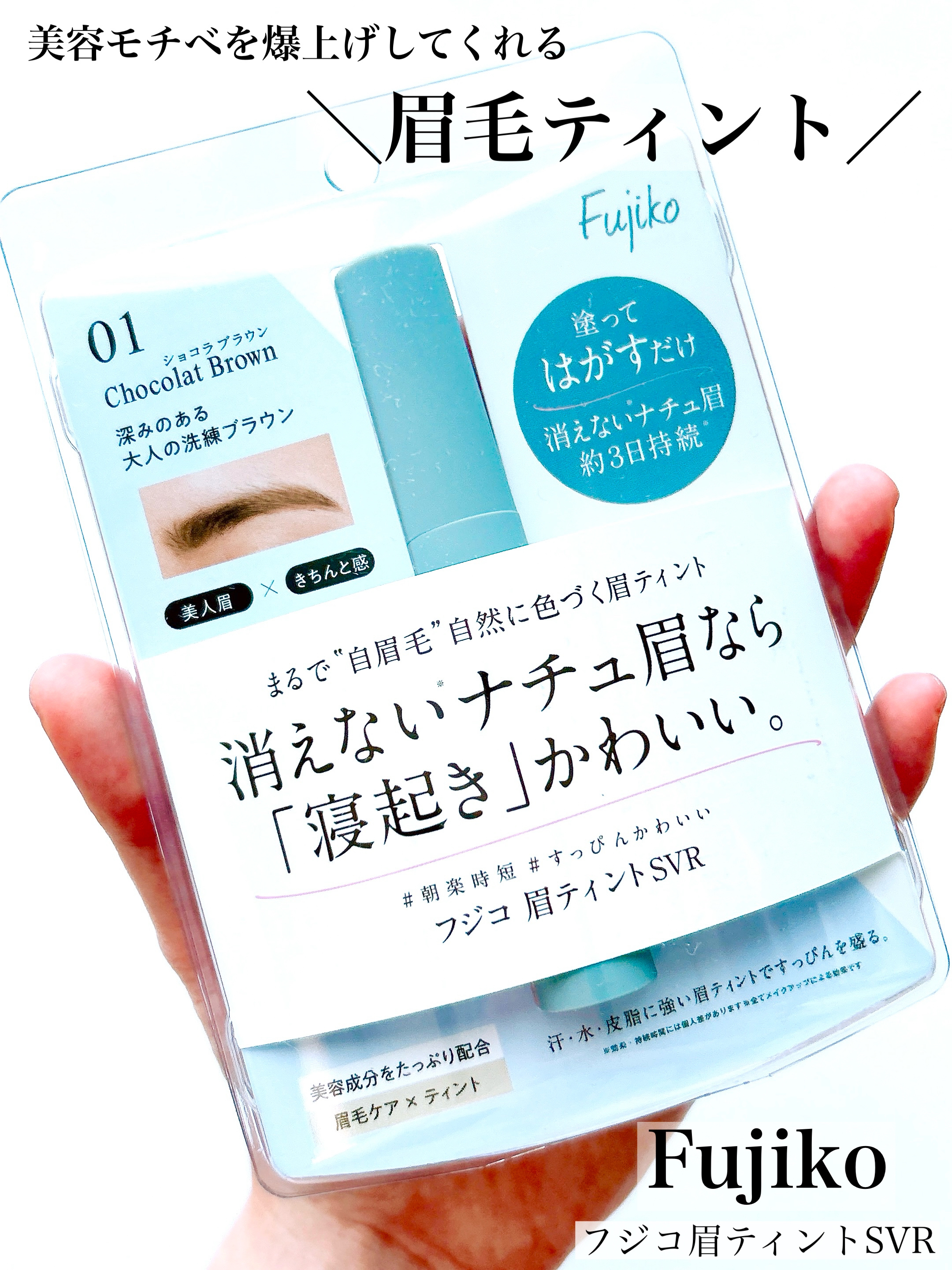 フジコ眉ティント 01ショコラブラウン 1,485円 (税込)です。眉ティント??ちょっと使いにくそう……、めっちゃ濃くなるのでは?って思ってたけど、これがすっごく使いやすかった✨ カラーが絶妙だから垢抜け眉にもおすすめ👀💓 私のおすすめの使い方は、眉のベースに眉ティントを仕込んでおくこと! 5種の美容成分が配合されているから特に荒れることはなかったよ🌸