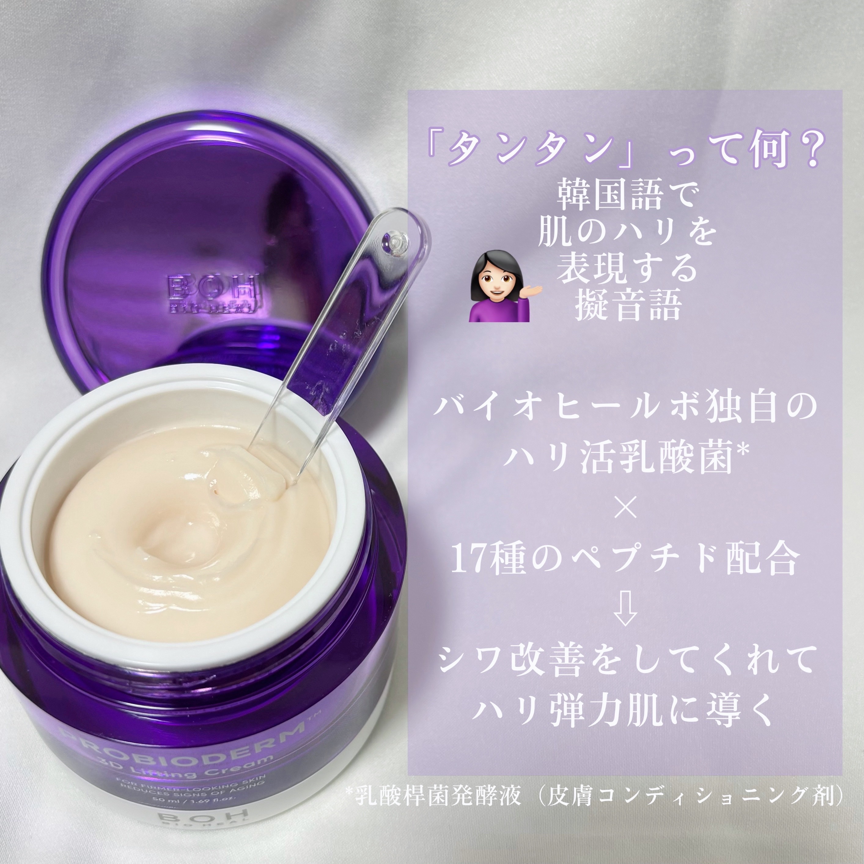 - プロバイオダーム™ 3D リフティングクリーム ・既存のタンタンクリームが、より一層のハリ弾力ケアができる商品としてパワーアップ※! ★プロバイオダーム™ 3Dリフティングクリームリニューアルポイント★ ①BIOHEAL BOHが厳選した乳酸菌*のみ配合した独自保湿成分!「プロバイオダーム™」 BIOHEAL BOHの厳しい審査のもとに選び抜かれた肌バリアをサポートする独自の乳酸菌*でハリ弾力ケアを! →キーワード #ハリ活乳酸菌 *厳選した乳酸菌:ラクトバチルスプランタラム&ラクトバチルスラムノサス&ラクトバチルスロイテリ(全て保湿) ②肌本来の弾力維持に欠かせない成分をプラス!肌が持つ成分を補うことで、ふっくらうるおった肌のハリ感をキープ ③ペプチドが12種から17種に!肌バリアを形成。素肌をすこやかに保ちます。 ・もちっと密度の高いクリームで保湿&ハリケア。 バイオヒールボ独自の技術で肌表面をピンとハリをあたえ、よりハリ感が得られるテクスチャーを実現 ・3Dと訴求しているように、ふっくらうるおい感のある多面的な弾力ケアができることから、韓国語でしっかりハリのある様子を表現するタンタン(탄탄)のワードと組み合わせて「3Dタンタンシクリーム」という愛称ができました。 ・もちっと密度の高いクリームで弾力のある素肌に導くエイジングケア※2クリーム。 ※同商品リニューアル前に比べて ※2年齢に応じたケアの事