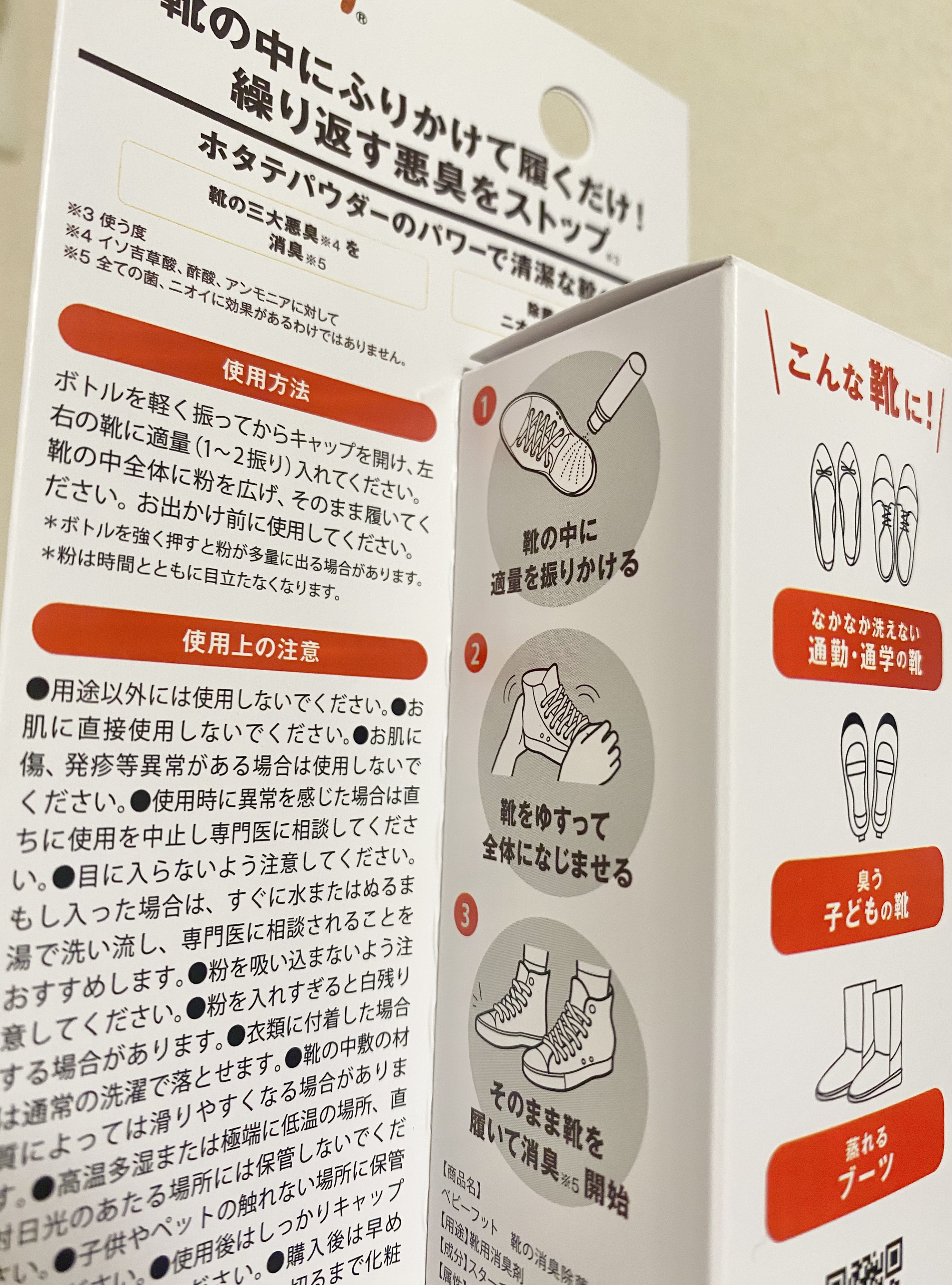 靴の中に振りかけて履くだけで靴のニオイを徹底消臭できるパウダー。 ホタルの焼成パウダーを40%高配合しており、靴を履いている間、消臭効果にすぐれた効果が期待できるんだとか。 匂いケアができるという意味ではありがたい商品ですが、ただ靴に振りかければ良いという感じでもなさそうかなと。