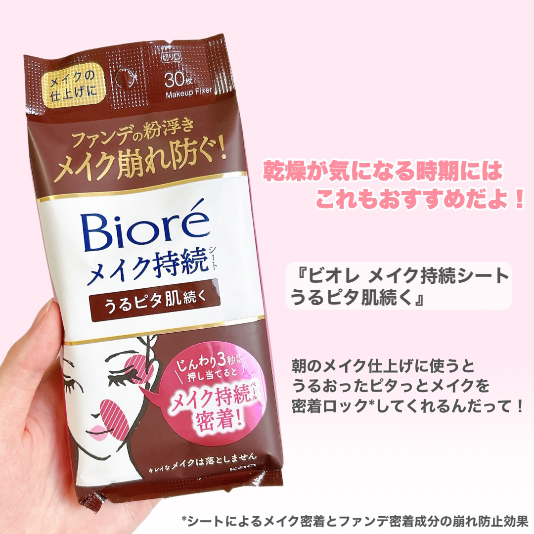 ビオレ様より商品提供していだたきました。Bioreメイクの上からうるピタ肌持続シート10枚入試供品試供品なので10枚入ですがコスパ良さげ◎《特徴》ファンデの粉浮き・しわヨレ防ぐ朝のメイクを密着ロック*¹!*¹うるピタ肌続く:シートによるメイク...