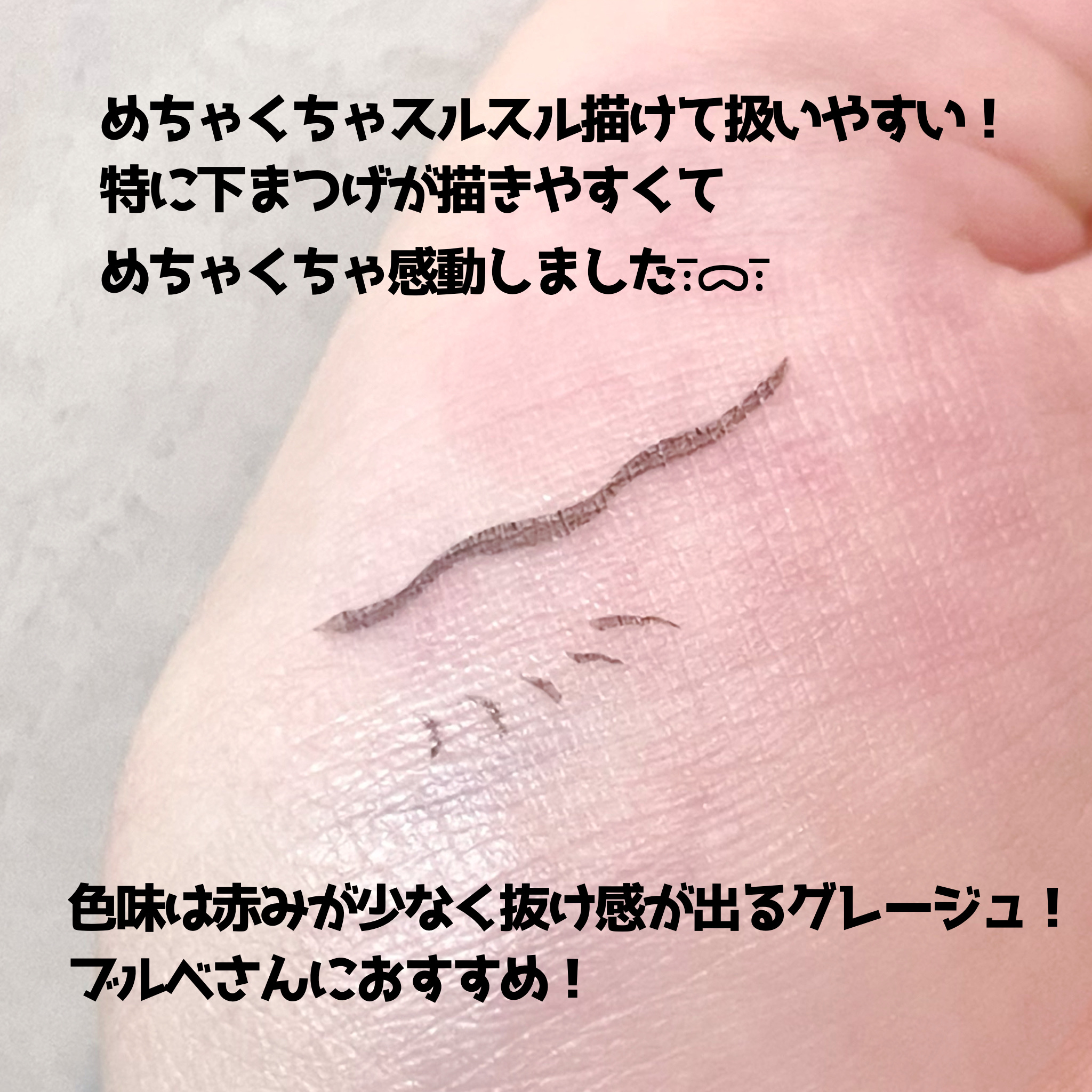 モカグレージュという色を頂いたのですが色素薄い系メイクに合いそうなカラーだなと思いました!また、赤みが少ないグレージュなのでめちゃくちゃブルベさんにオススメしたいカラーだなと思います✨ アイライナーに重みがあったので安定して描きやすい……!!また、下まつげがとても描きやすいなとも感じました! 発色はちゃんとしているし落ちにくいのでスクールメイクなどにも使いやすそうでいいなと思いました!