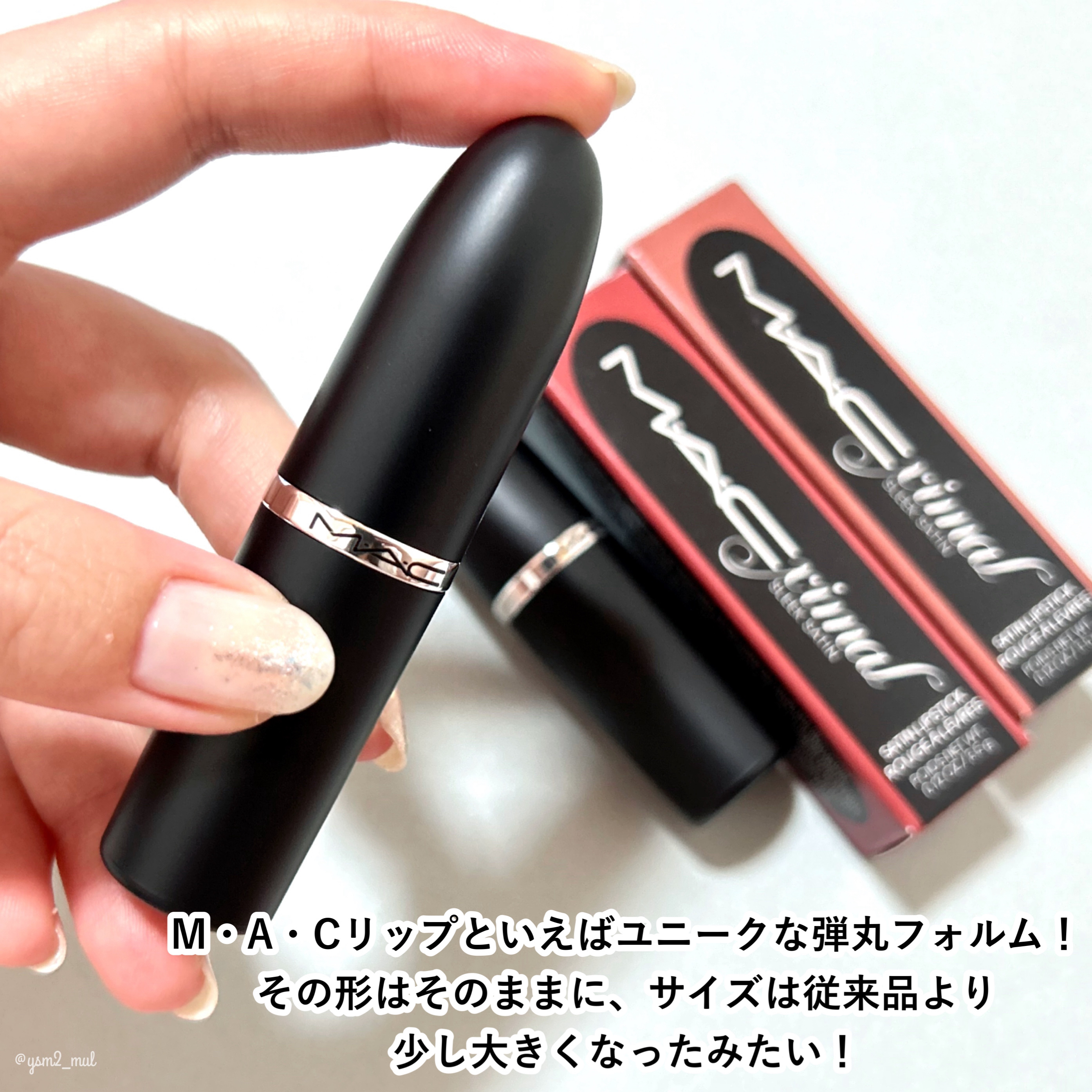 - <価格改定>2025年7月1日より¥4,620(税込)から¥4,400(税込)に改定いたします。 保湿成分をM・A・C史上最高*濃度で閉じ込め 驚きの濃密発色・贅沢なつや・うるおいで、つやオーラリップを作る #美容液サテンリップ が登場。 ①美容保湿成分をM・A・C史上最高*1濃度で配合した、#美容液サテンリップ: 新・マキシマルスリークサテンリップスティックは、高発色でありながら、乾燥レスなサテンのつやをまとわせます。 その秘密は、うるおいを作り出す厳選した天然由来の美容保湿成分をM•A•C史上最高*1濃度で配合しているから。美容の果実と言われる、ザクロから抽出されたザクロ花エキス*2をはじめ、ローズヒップオイル*2、ユチャ種子油*2を配合しています。 乾燥しがちな唇のすみずみまで濃厚な潤いを与え、みずみずしい仕上がりが続きます。 発色も欲しい、保湿も欲しい、そんな人の為の #美容液サテンリップです。 「発色は良いけど乾燥する」と思われてきたM•A•Cのリップが進化!発色と保湿を両立です。 ②リップ&チークのマルチユース: リップスティックとしてだけでなく、チークとしても使えます。 これ1本で、トレンドのワントーンメイクを簡単に表現できます。 ③毎日のどんなシーンにも使える、厳選された色展開: M•A•Cのリップは、派手な色が多くて、毎日使えない!ということはありません! 毎日の何気ないシーンやビジネスなど、デイリーに使いたいけどトレンド感も欲しい時、 お友達とのおでかけや飲み会、デートなど、おしゃれをしたい時、 パーティやクラブなど、華やかなメイクをしたい時、 厳選された21色の色展開で、どんな時でも、つやオーラのあるあなたへ導きます。 *1 M・A・Cサテンリップの中で *2 保湿成分 2024年10月4日 (金) 全国店舗・M・A・C公式オンラインショップ発売 2024年9月20日 (水) 楽天M・A・C公式ショップ/ZOZOCOSME M·A·C 公式ショップ 先行予約開始