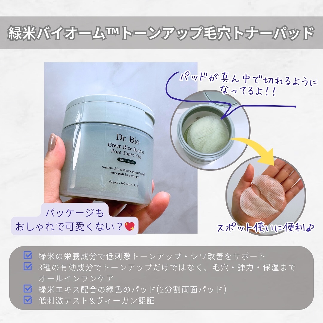 敏感肌でも安心して使えるアイテムたち🥰 緑米バイオーム™トーンアップスキンケアシリーズは「古代米」と呼ばれる緑米エキスと、Dr.Bio独自のプロバイオティクス成分のPREBIOME™配合の新感覚トーンアップスキンケアライン! 毛穴・弾力・保湿までオールインワンケアできるパッド🎶 リオセル面はガーゼのような触り心地で角質ケアに◎ 保湿やトーンアップ、お肌の保護までこれ1本! メイク前にこれを仕込むことで、ツヤ肌完成🥰