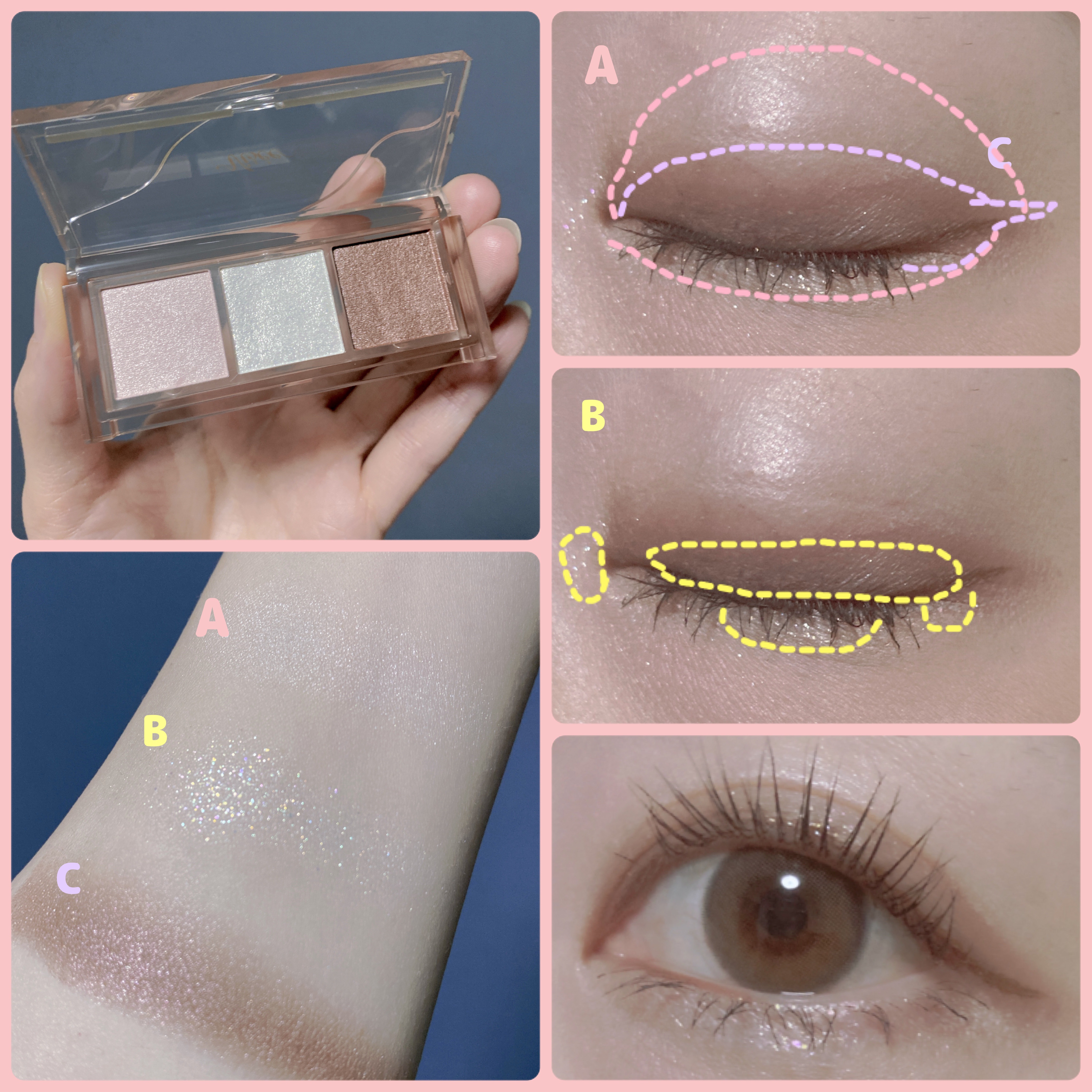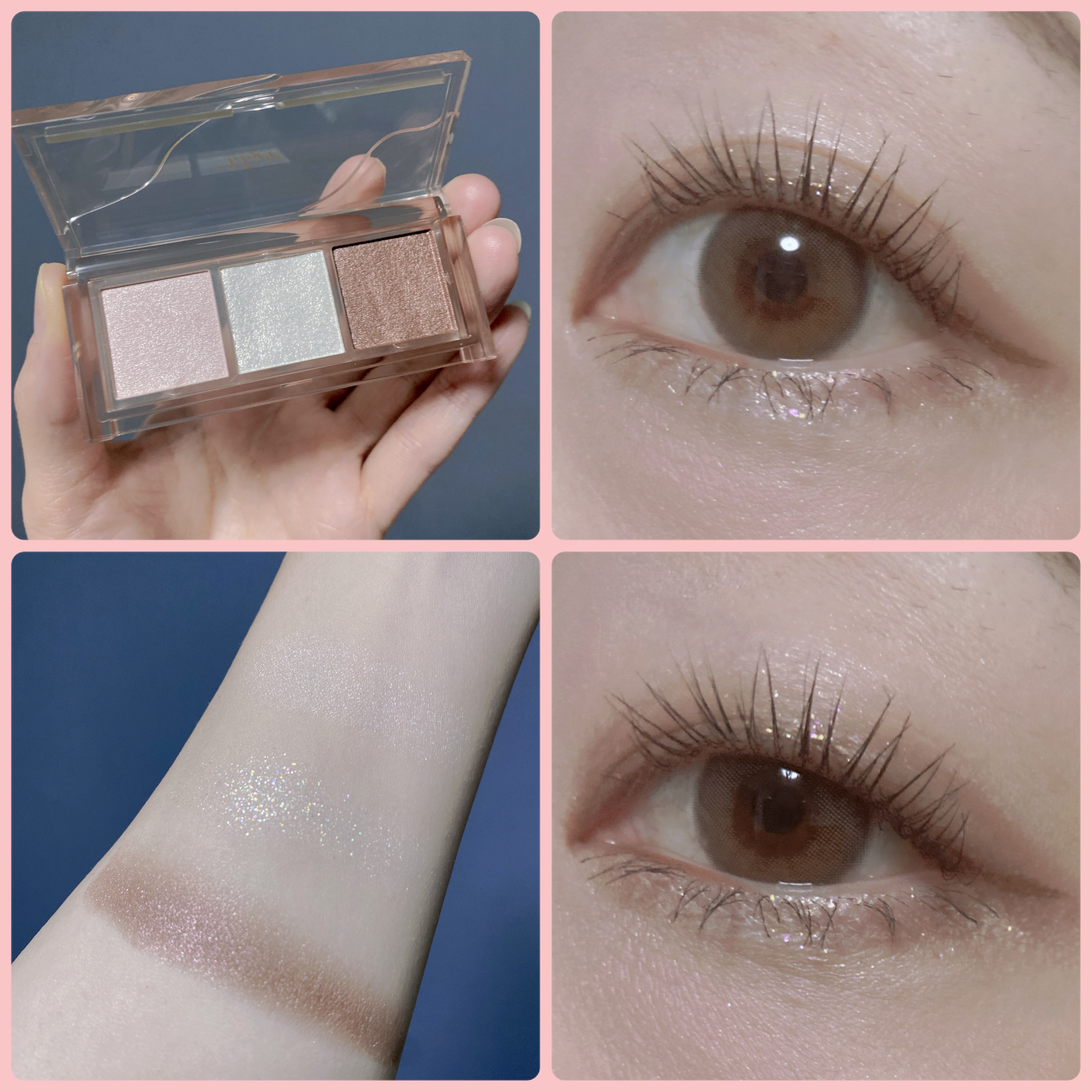 - 角度によって色が変わる高輝度偏光パールを多量配合。動くたび輝きが変化する高密着な3色入りセットアイカラー。 ● 高輝度偏光パールと大粒グリッターを贅沢に配合した、3 色セットのアイカラーです。 まぶたにしっとりとけこむようにフィットして、大粒パールやグリッターも高密着。 大胆に輝き、色気を放つ目もとがつづきます。 ● 見る角度や光の当たり具合により色味が変化する高輝度偏光パール(カラーチェンジグリッター)とクリアで高輝度な大粒グリッターを組み合わせて配合。 まばたきや動きにより色と輝きが変化する、魅力的な目もとを演出します。 ● 化粧もちを高めるフィットオイル成分配合。まぶたにピタッと密着し、パール落ちを防止。 高い透明感とツヤ感も付与し、美しい仕上がりが持続します。 ● カラーによって異なるベースを採用。 [ハイライトカラー(A)] もちっと生質感で、肌にとけこむように密着するスフレベース。 繊細なパールの輝きで、まぶたに光を取りこみ、下地効果でアイカラーの密着も高めます。 [グリッターカラー(B)] 輝きを最大限に引き出す透明性の高いベースに、高輝度偏光パールと大粒グリッターを贅沢に配合。 密着性の高いフィットオイル成分とペーストオイルをかけあわせることで、パール落ちも防止。 [アクセントカラー(C)] のび広がりのよさと高い密着性を両立して美発色を叶えたベース。 フィットオイル成分を最高量配合(パレット内比)し、粉体をコーティングすることで クリアで美しい発色と上質なツヤが持続します。 ● 無香料
