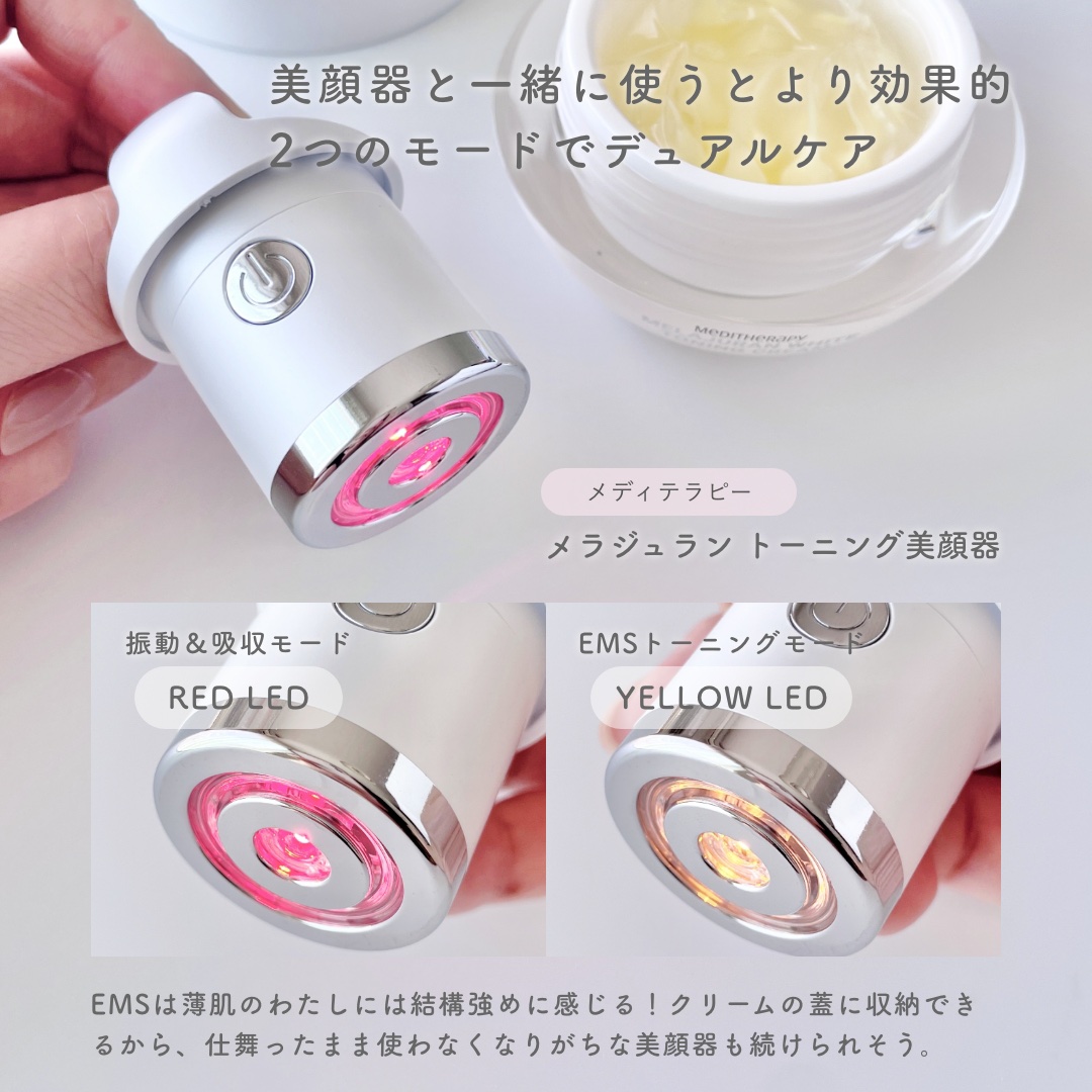 たまごみたいなクリームと美顔器が一体に🥚 クリームと美顔器の相乗効果で、肌への浸透をさらに高めるトーンアップクリームでくすみケア。 EMSトーニングモード マイクロカレント(微細電流)で水溶性の有効な美容成分を肌の深部まで浸透させ、肌のトーンや弾力UP ホワイトトマト水とピュアグルタチオンの複合成分の独特の香りも特徴的なので、好みは分かれそう。