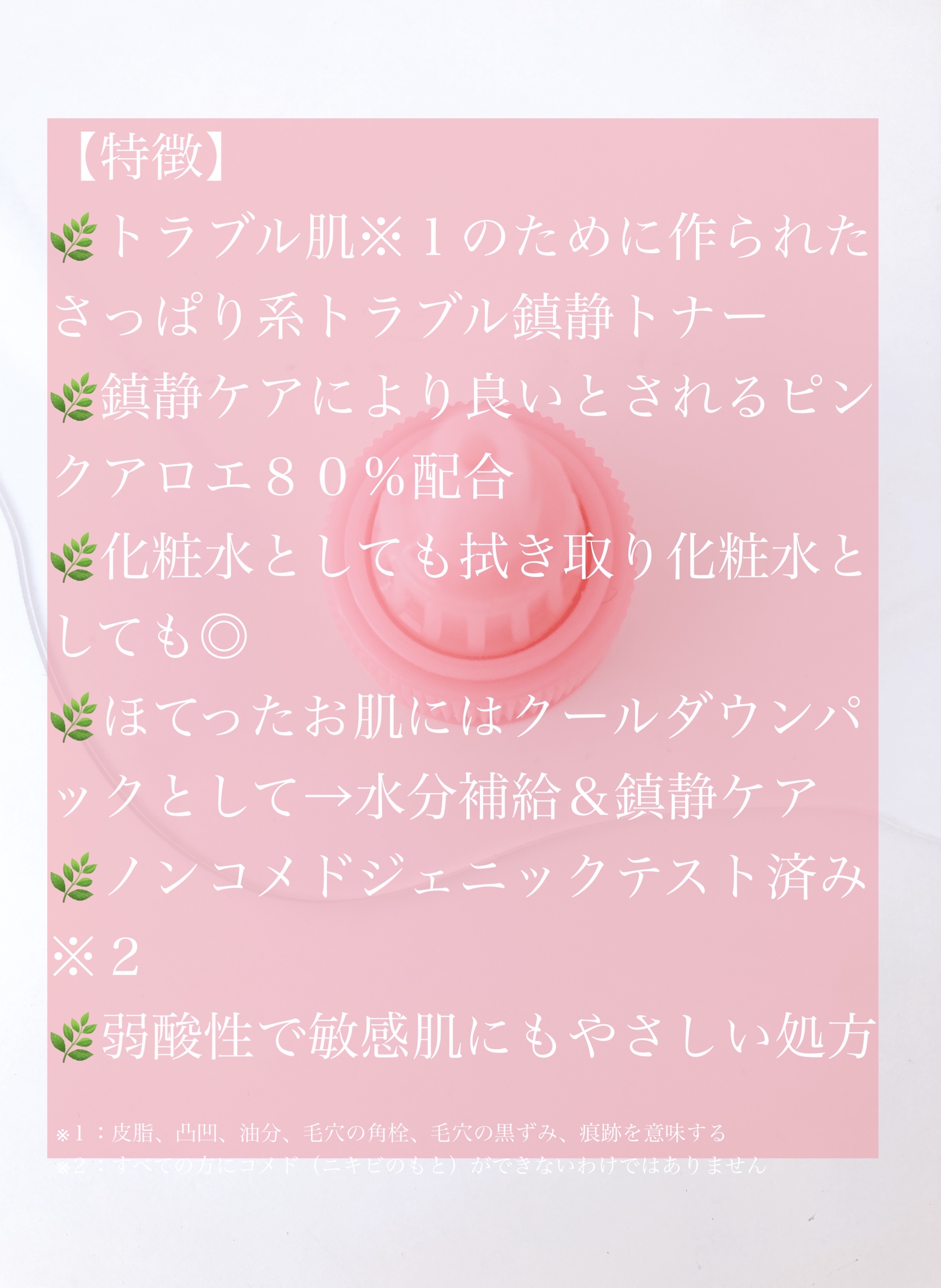 ピンクでかわいいトナー♡ とんがりキャップが付属されていて、付け替えて使うよ𓂃◌𓂂 このトナーはそんなピンクアロエを80%も配合している🌿𓂃◌𓈒𓐍 トナーなのにまるでエッセンス級⟡.· トラブル肌・敏感肌におすすめなので夏の日焼けしたお肌のクーリングにじゃぶじゃぶ使いたい!
