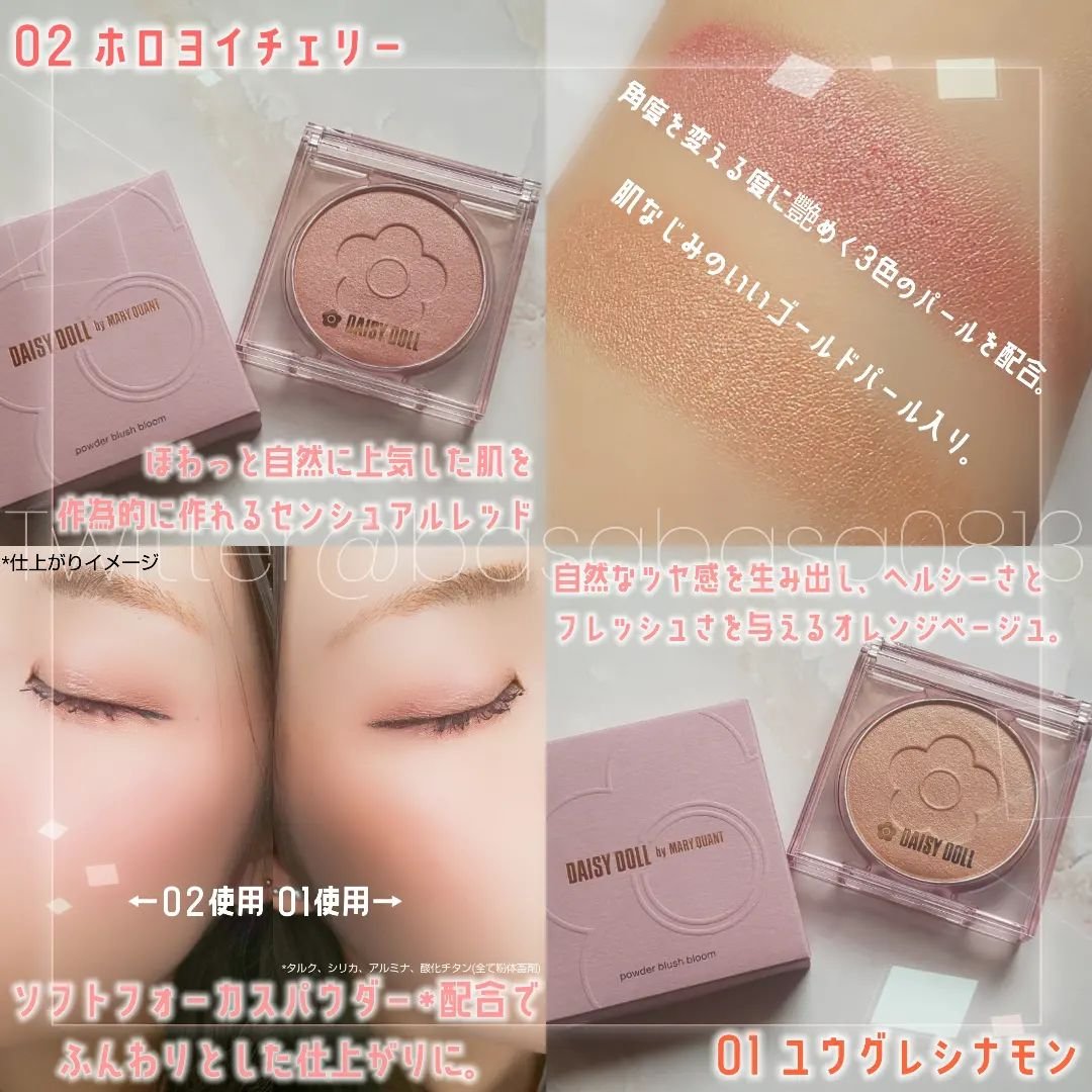 - 25年秋、チーク新色2色と、初のハイライト2色が登場!どちらもデイジーマークとキルティングのエンボス加工を施したガーリーなデザインです。 デイジードール ブランドの中でも人気の高いパウダーブラッシュ ブルームが全9色展開に。 チークは、ふんわり肌に溶け込むように馴染み、血色感を自在に操るしっとり高密着タイプ。 初のハイライトは、異なる偏光パールを配合し、光とツヤ、そして立体感が楽しめます。どちらもしっとりとしたテクスチャーで毛穴など肌の気になる部分をぼかしながら、ふんわりと溶け込むように馴染み、ツヤのある美しい肌を保ちます。 高保湿タイプのトリプル美容オイル*1とうるおい持続パウダー*2配合で、お肌にうるおいを与えます。 *1:ダマスクバラ花油、カニナバラ果実油、アルガニアスピノサ核油(全て保湿成分) *2:シリカ(粉体基剤)、ヒアルロン酸Na(保湿成分)
