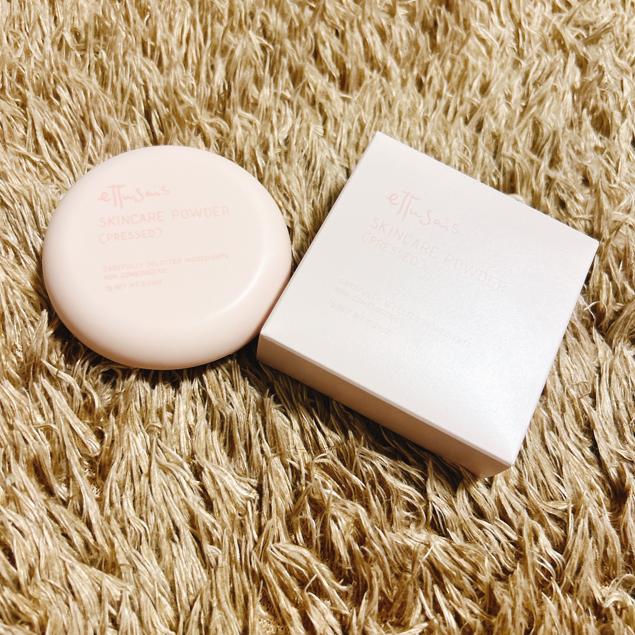 薄ピンクのプレストパウダー 触ってわかるしっとり質感 仕上がりの肌の見た目は内側のツヤが若干透けて 触ると結構しっっとりした仕上がり 夜も使えるスキンケアパウダーなので肌にやさしい処方だから