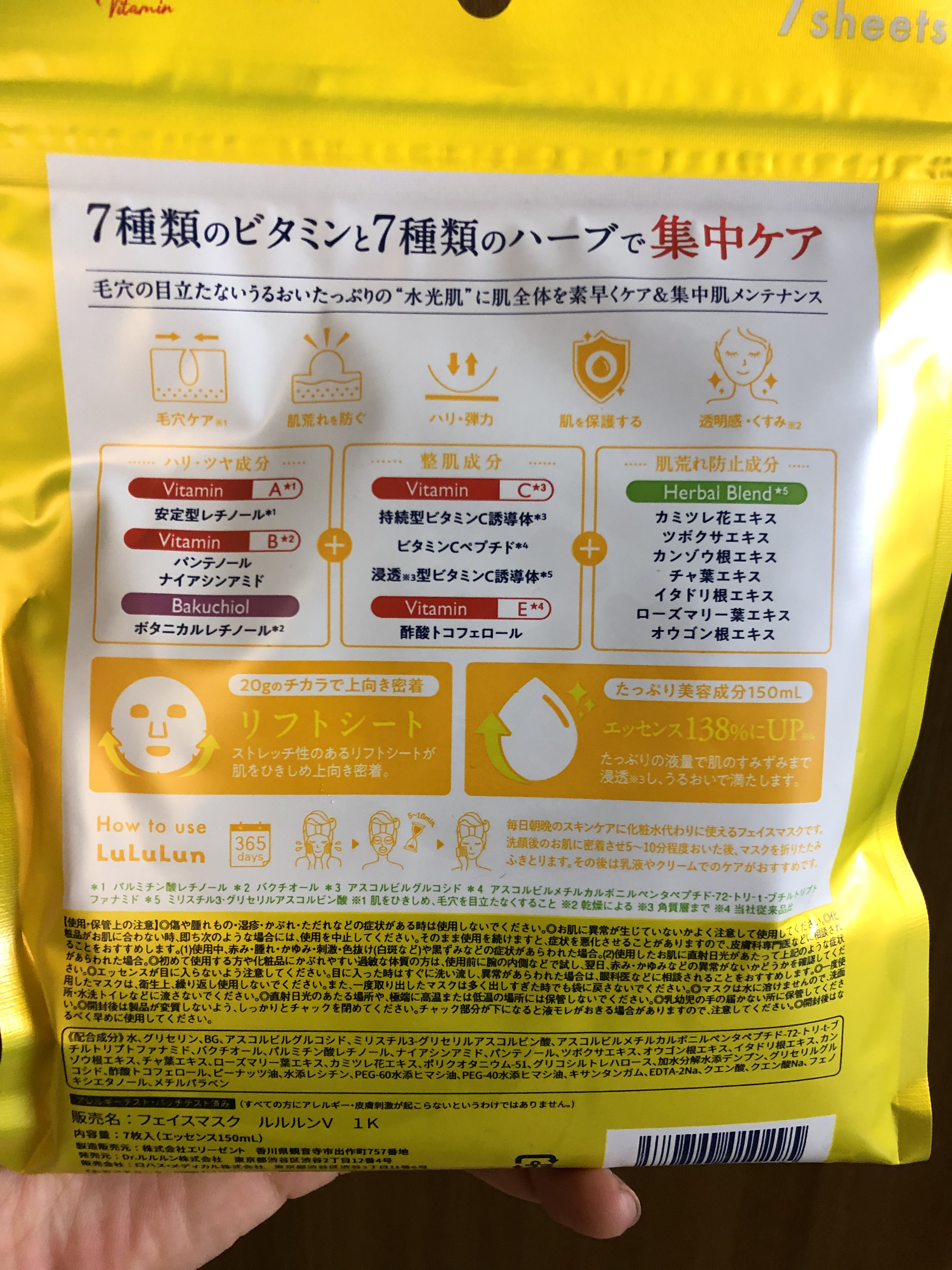 - ルルルンからビタミンたっぷりの化粧水フェイスマスクが新登場。 7種類のビタミン※1と7種類のハーブ※1で肌全体を素早くケア&集中肌メンテナンス。 新開発のフェイスラインに密着するシートで肌を引き締めながら肌のすみずみ※2までうるおいで満たし、毛穴の目立たないうるおいたっぷりの“水光肌”へ。 (※1 全て保湿成分として ※2 角質層まで)