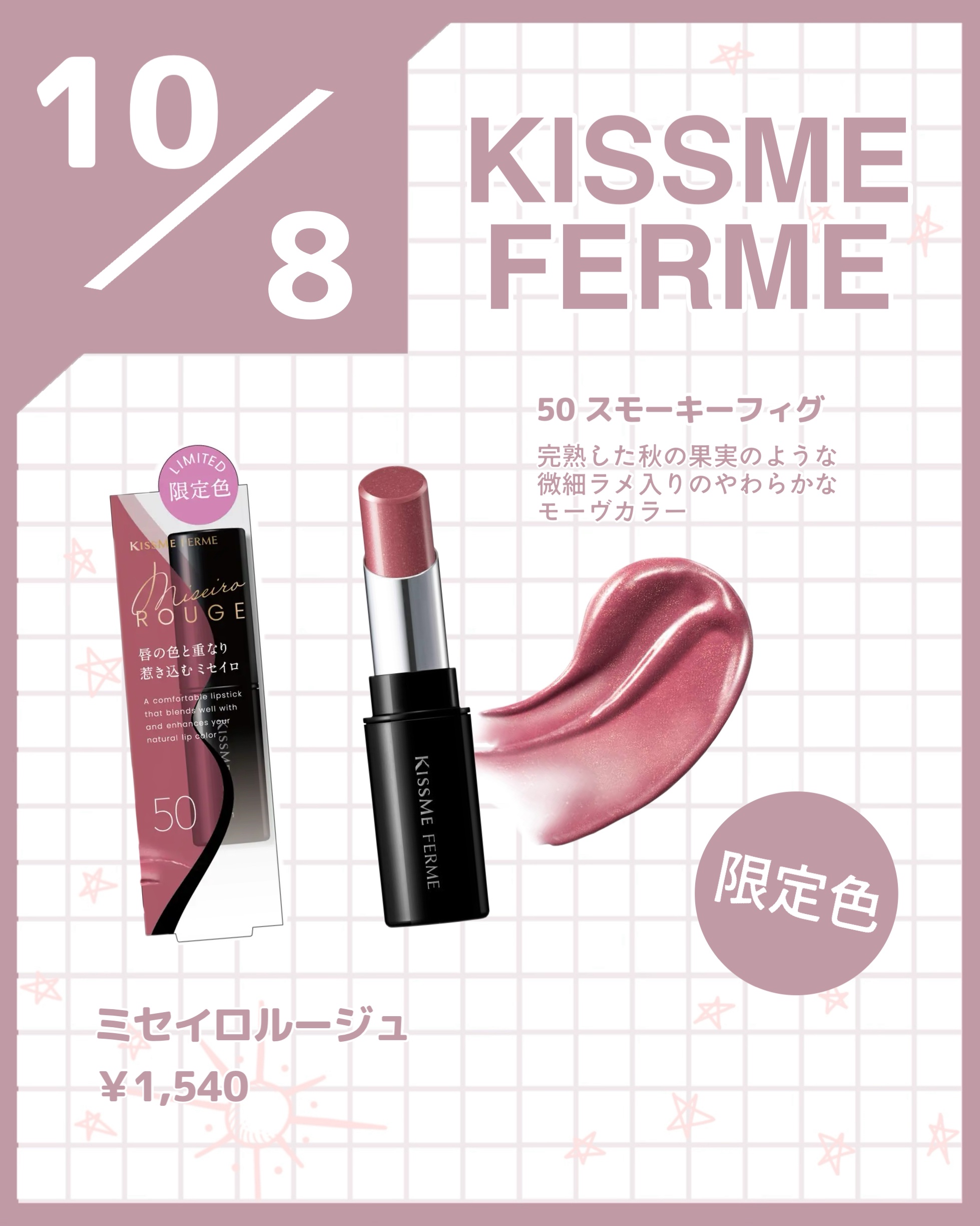 キスミーフェルムの大人気商品「ミセイロルージュ」秋の限定色 2024年10月8日(火)数量限定発売 トレンドの「つやちゅるん唇」が長時間続く ・唇の上でスルスルと「とろける塗り心地」 リップは、かなり細かいゴールドラメが沢山入ってます。実際見てもそこまでギラギラで感はないのでラメは目立たなくて艶感が綺麗です。