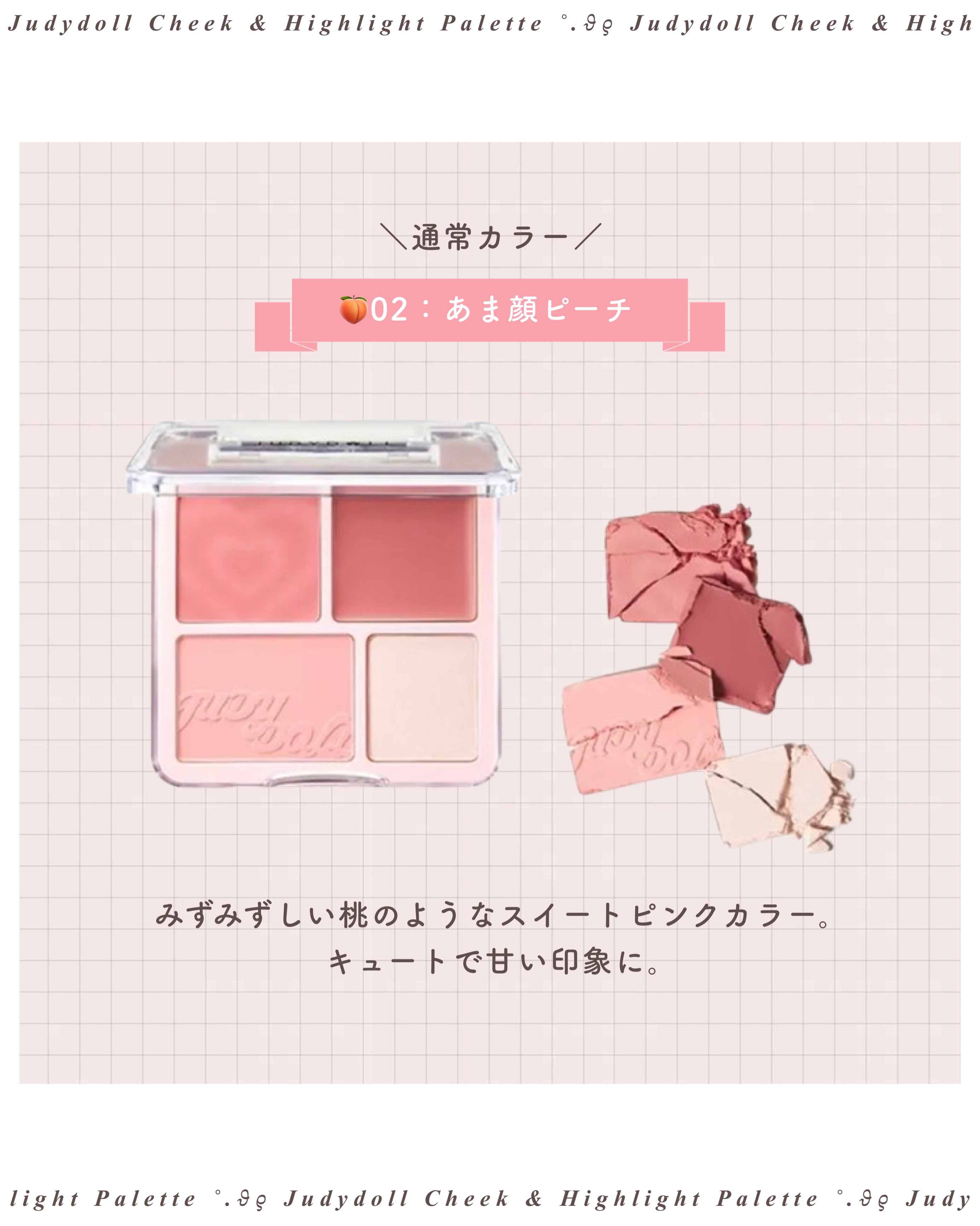 あざとくわがままに可愛くなっちゃお♡🏷️JUDYDOLLわがままチークハイライター🍈01うぶ顔メロン完熟メロンのようにあたたかなピュアオレンジカラー初々しい雰囲気に🍑02あま顔ピーチみずみずしい桃のようにスイートなピンクカラーとろける笑顔で甘...